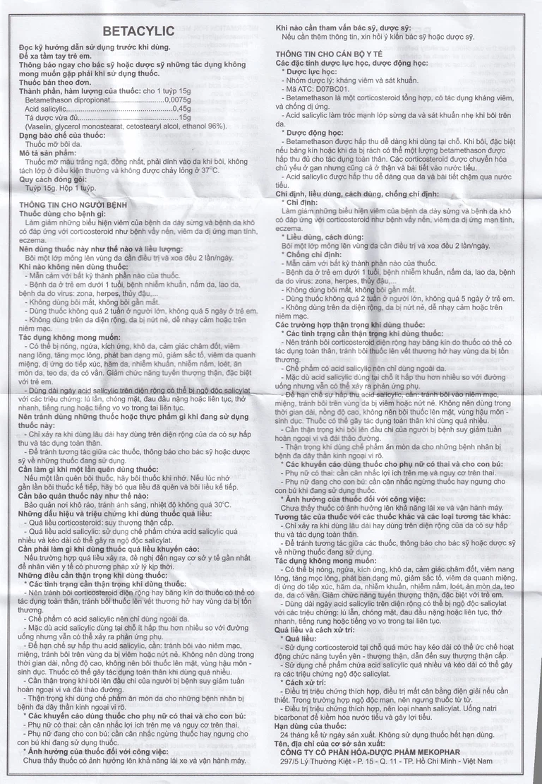 Thuốc Betacylic 15 g của Công ty CP Hóa – Dược phẩm Mekophar có thành phần chính Betamethasone dipropionate 0,0075 g và Acid salicylic 0,45 g, đây là một loại thuốc điều trị hiệu quả các bệnh da liễu. Với những thành phần có trong thuốc, Betacylic 15 g sẽ là biện pháp giảm nhanh các triệu chứng của viêm da, vẩy nến, viêm da dị ứng mạn tính, viêm thần kinh và nhiều trường hợp bệnh da liễu khác.