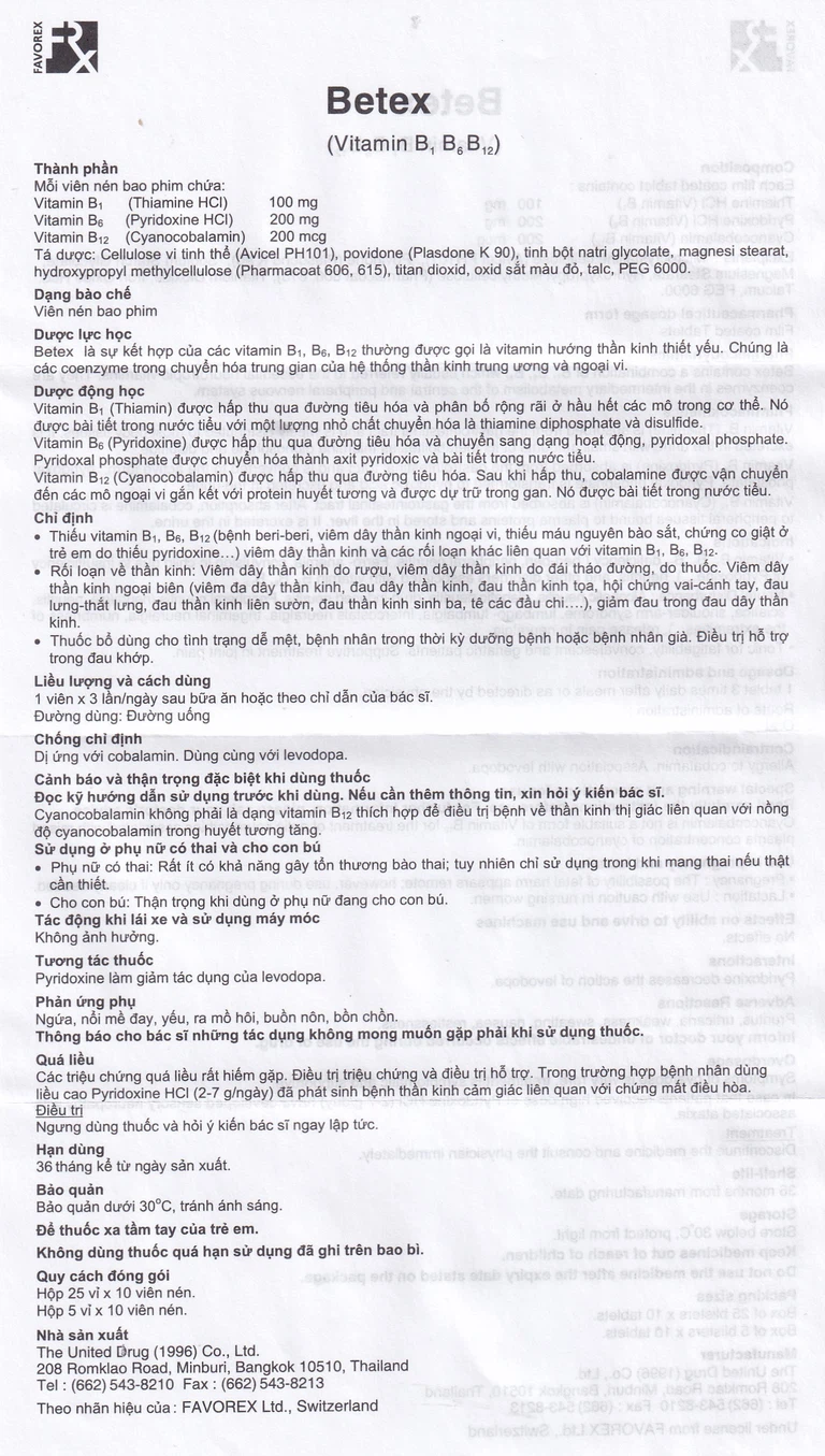 Betex là sự kết hợp của các vitamin B1, B6, B12 thường được gọi là vitamin hướng thần kinh thiết yếu. Chúng là các coenzyme trong chuyển hóa trung gian của hệ thống thần kinh trung ương và ngoại vi.
