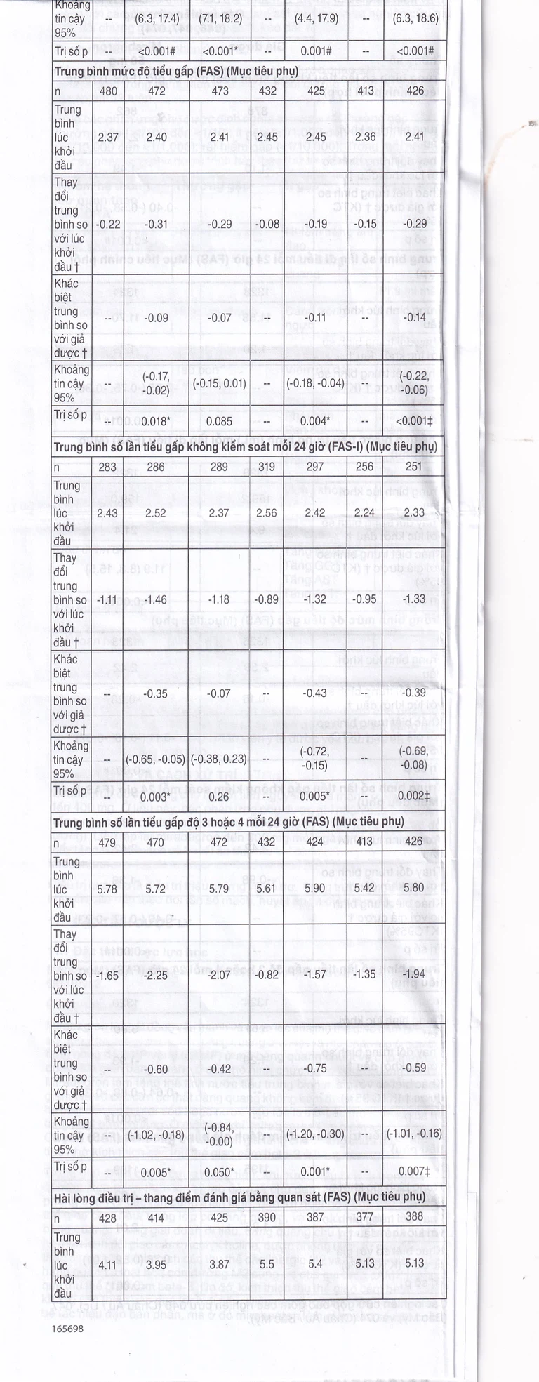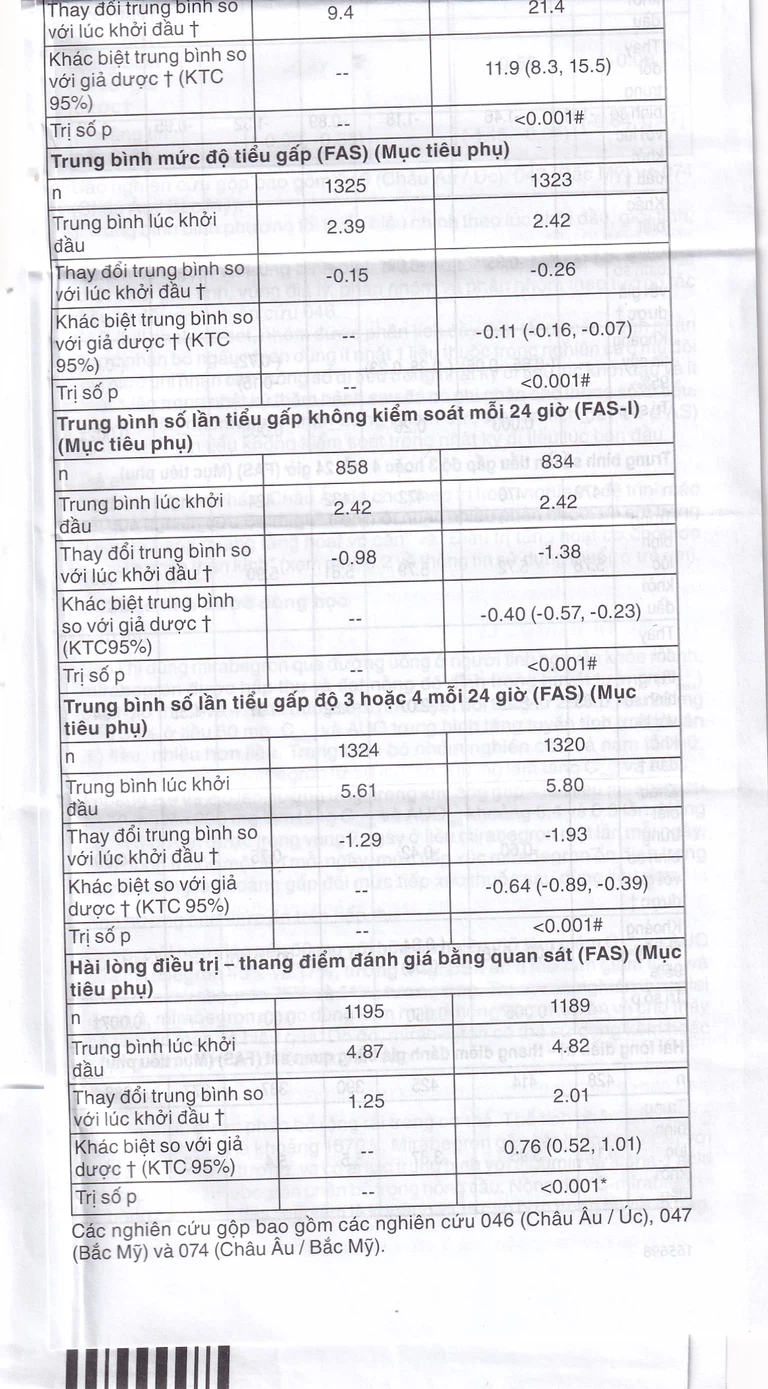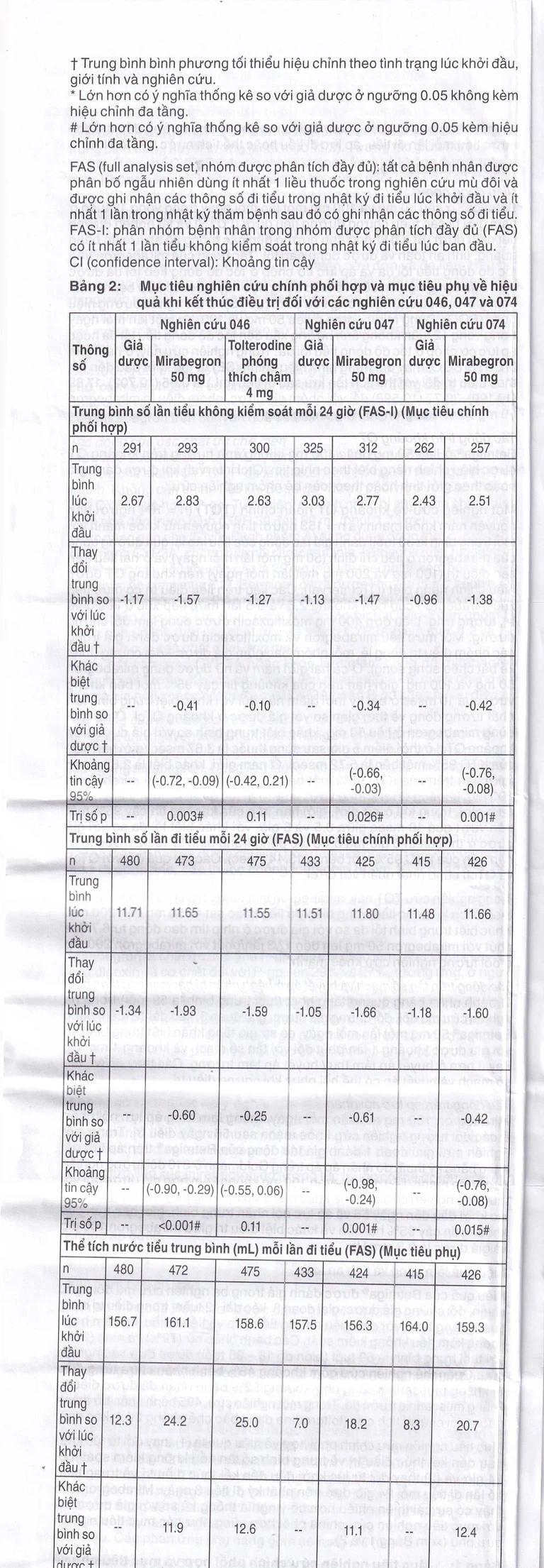 Mục tiêu nghiên cứu chính phối hợp về hiệu quả là (1) thay đổi từ lúc khởi đầu đến kết thúc điều trị về trung bình số lần tiểu không kiểm soát mỗi 24 giờ và (2) thay đổi từ lúc khởi đầu đến kết thúc điều trị về trung bình số lần đi tiểu mỗi 24 giờ dựa trên nhật ký đi tiểu 3 ngày. Mirabegron cho thấy có sự cải thiện nhiều hơn có ý nghĩa thống kê so với giả dược đối với mục tiêu nghiên cứu chính phối hợp cũng như các mục tiêu nghiên cứu phụ.