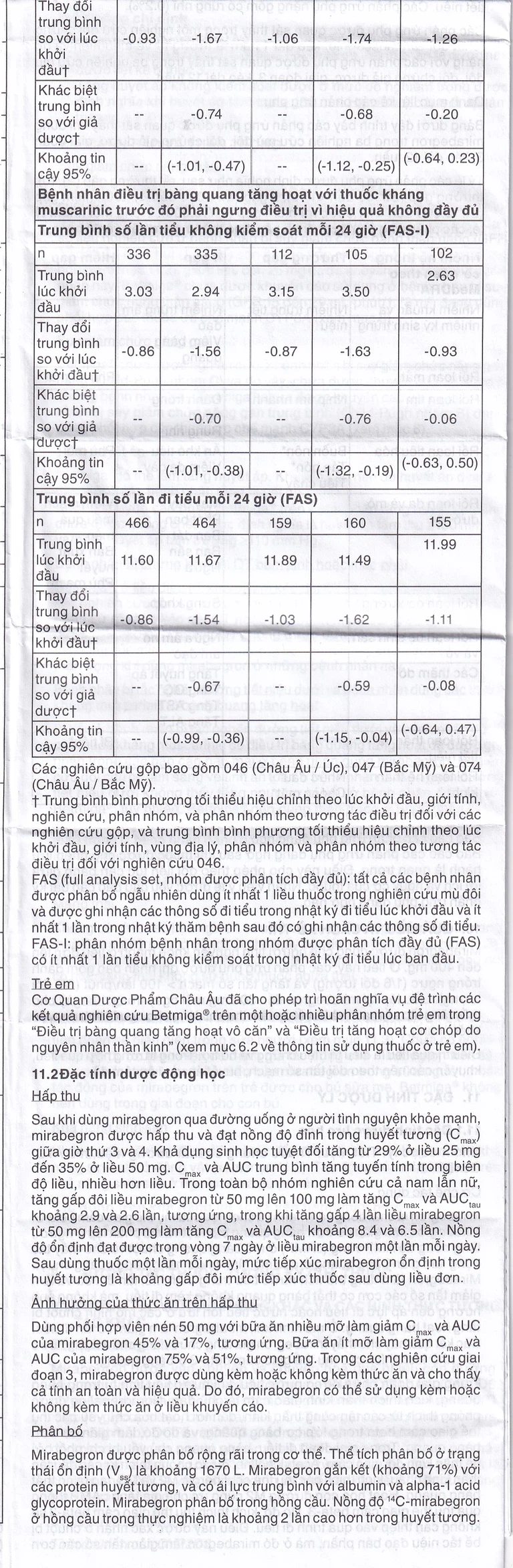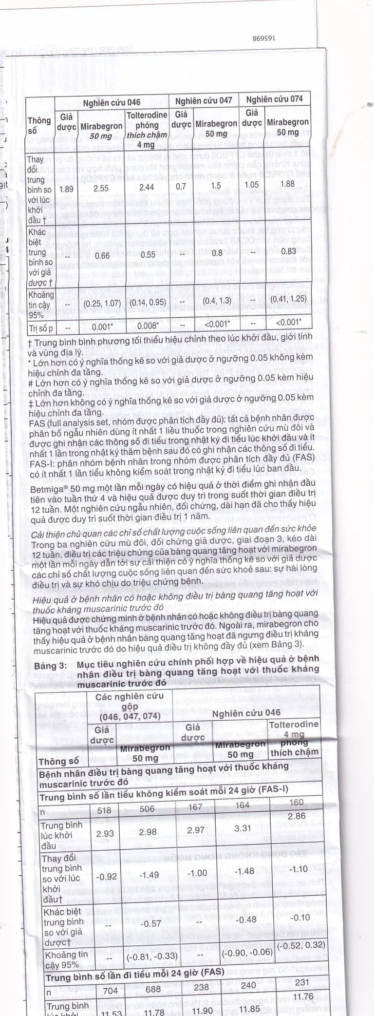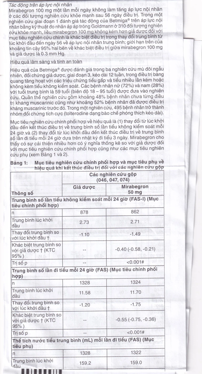 Hiệu quả của Betmiga được đánh giá trong ba nghiên cứu mù đôi ngẫu nhiên, đối chứng giả dược, giai đoạn 3, kéo dài 12 tuần, trong điều trị bàng quang tăng hoạt với các triệu chứng tiểu gấp và tiểu nhiều lần kèm hoặc không kèm tiểu không kiểm soát. Các bệnh nhân nữ (72%) và nam (28%) với tuổi trung bình là 59 tuổi (biên độ 18 – 95 tuổi) được đưa vào nghiên cứu. Quần thể nghiên cứu gồm khoảng 48% bệnh nhân chưa từng điều trị kháng muscarinic cũng như khoảng 52% bệnh nhân đã được điều trị kháng muscarinic trước đó. Trong một nghiên cứu, 495 bệnh nhân trở thành nhóm đối chứng tích cực (tolterodine dạng bào chế phóng thích kéo dài).