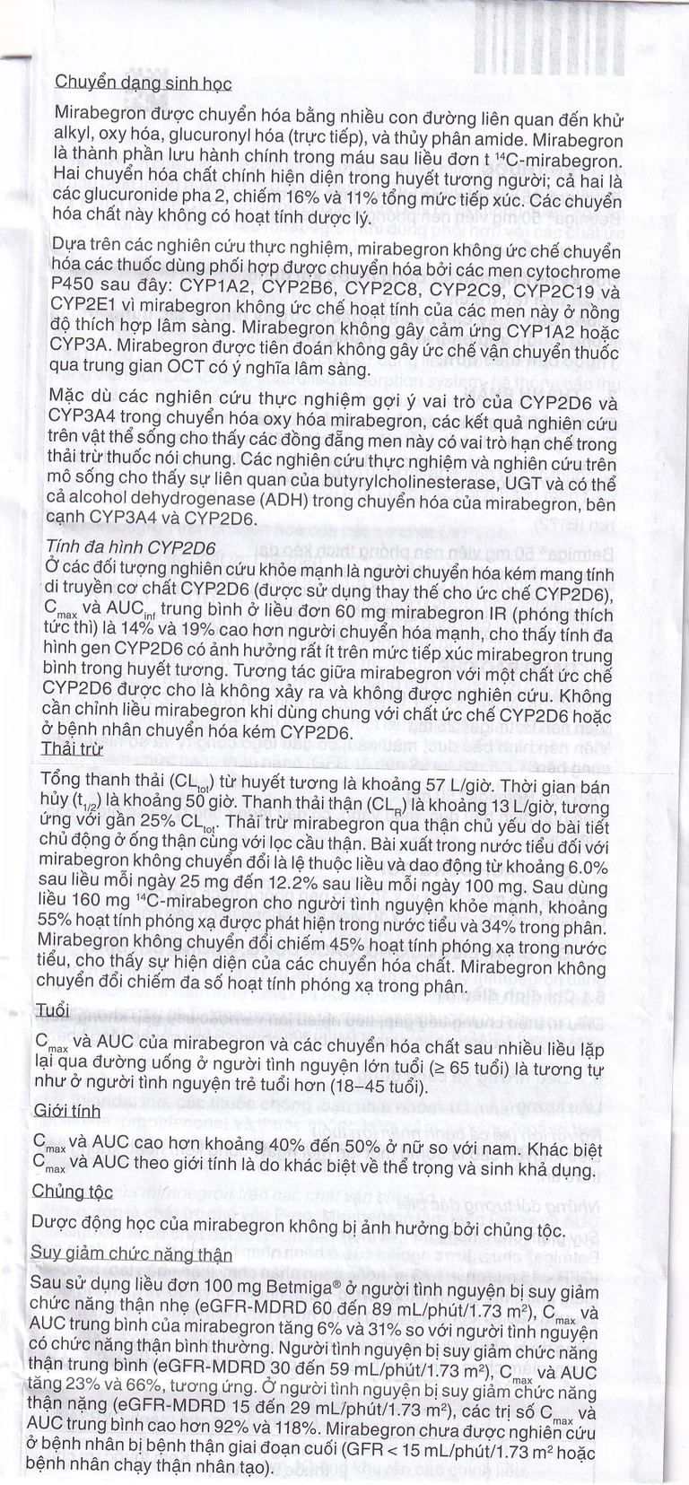 Sau sử dụng liều đơn 100 mg Betmiga ở người tình nguyện bị suy giảm chức năng thận nhẹ (eGFR-MDRD 60 đến 89 mL/phút/1.73 m2), Cmaxvà AUC trung bình của mirabegron tăng 6% và 31% so với người tình nguyện có chức năng thận bình thường. Người tình nguyện bị suy giảm chức năng thận trung bình (eGFR-MDRD 30 đến 59 mL/phút/1.73 m2), Cmaxvà AUC tăng 23% và 66%, tương ứng. Ở người tình nguyện bị suy giảm chức năng thận nặng (eGFR-MDRD 15 đến 29 mL/phút/1.73 m2), các trị số Cmax AUC trung bình cao hơn 92% và 118%. Mirabegron chưa được nghiên cứu ở bệnh nhân bị bệnh thận giai đoạn cuối (GFR <15 mL/phút/1.73 m2hoặc bệnh nhân chạy thận nhân tạo).