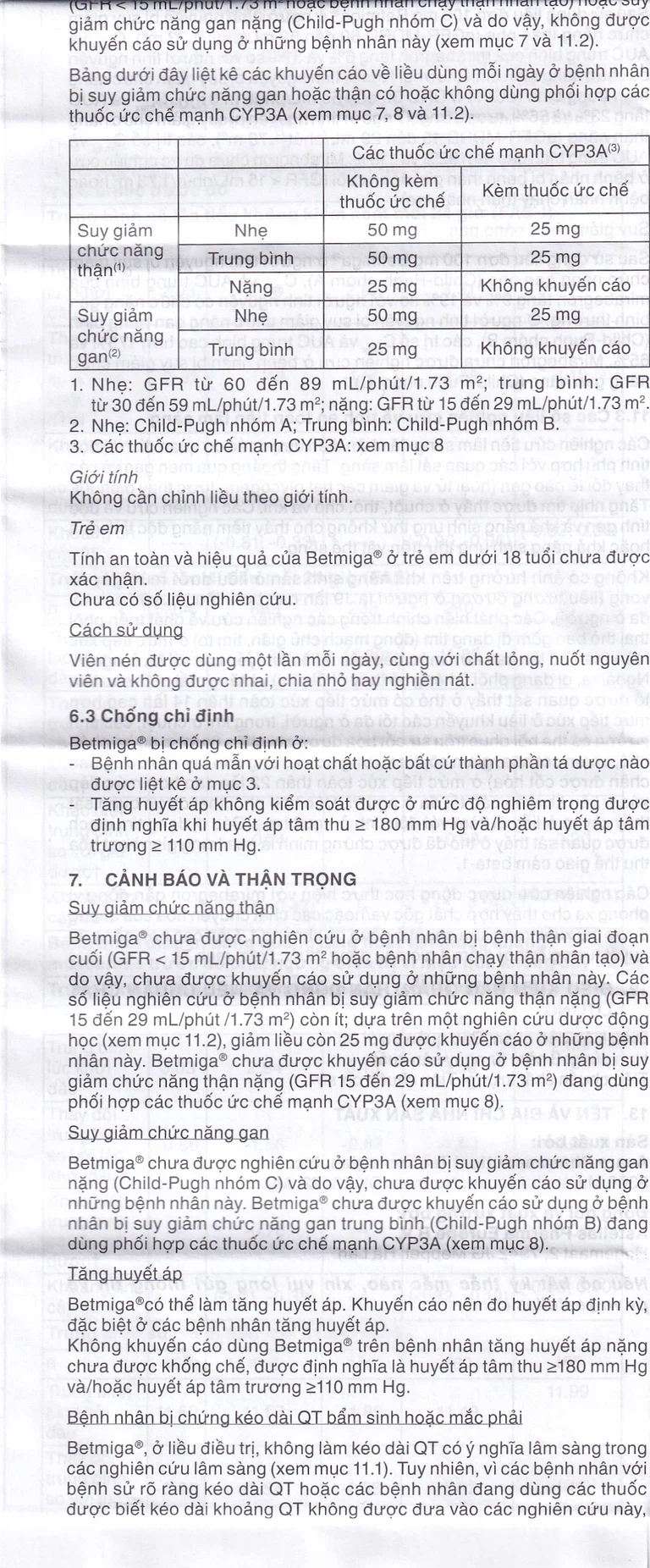 Betmiga chưa được nghiên cứu ở bệnh nhân bị bệnh thận giai đoạn cuối (GFR <15 mL/phút/1.73 m2hoặc bệnh nhân chạy thận nhân tạo) hoặc suy giảm chức năng gan nặng (Child-Pugh nhóm C) và do vậy, không được khuyến cáo sử dụng ở những bệnh nhân này.