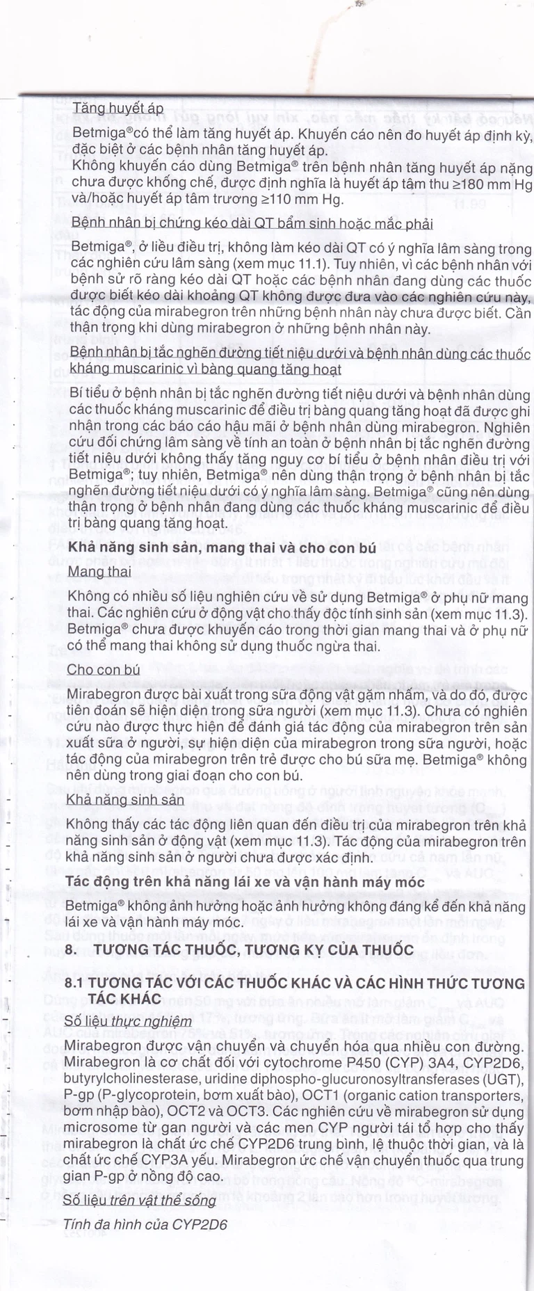 Betmiga ở liều điều trị, không làm kéo dài QT có ý nghĩa lâm sàng trong các nghiên cứu lâm sàng. Tuy nhiên, vì các bệnh nhân với bệnh sử rõ ràng kéo dài QT hoặc các bệnh nhân đang dùng các thuốc được biết kéo dài khoảng QT không được đưa vào các nghiên cứu này, tác động của mirabegron trên những bệnh nhân này chưa được biết. Cần thận trọng khi dùng mirabegron ở những bệnh nhân này.