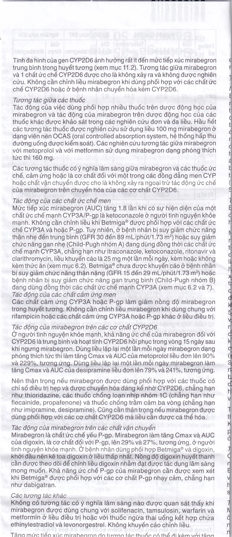 Mirabegron là chất ức chế yếu P-gp. Mirabegron làm tăng Cmaxvà AUC của digoxin, là cơ chất đối với P-gp, lên 29% và 27%, tương ứng, ở người tình nguyện khỏe mạnh. Ở bệnh nhân dùng phối hợp Betmiga và digoxin, khởi đầu nên kê toa digoxin ở liều thấp nhất. Nồng độ digoxin huyết thanh cần được theo dõi để chỉnh liều digoxin nhằm đạt được tác dụng lâm sàng mong muốn. Khả năng ức chế P-gp của mirabegron cần được xem xét khi Betmiga được phối hợp với các cơ chất P-gp nhạy cảm, chẳng hạn như dabigatran.