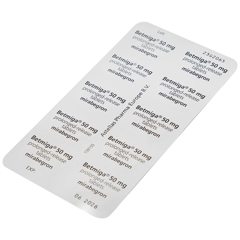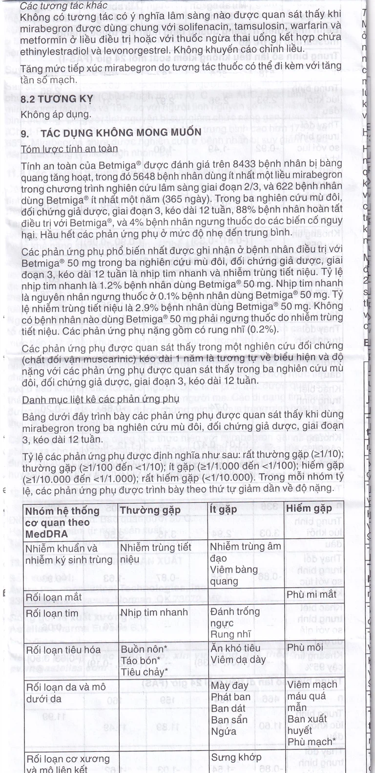 Các phản ứng phụ phổ biến nhất được ghi nhận ở bệnh nhân điều trị với Betmiga 50 mg trong ba nghiên cứu mù đôi, đối chứng giả dược, giai đoạn 3, kéo dài 12 tuần là nhịp tim nhanh và nhiễm trùng tiết niệu. Tỷ lệ nhịp tim nhanh là 1.2% bệnh nhân dùng Betmiga 50 mg. Nhịp tim nhanh là nguyên nhân ngưng thuốc ở 0.1% bệnh nhân dùng Betmiga 50 mg. Tỷ lệ nhiễm trùng tiết niệu là 2.9% bệnh nhân dùng Betmiga 50 mg. Không có bệnh nhân nào dùng Betmiga 50 mg phải ngưng thuốc do nhiễm trùng tiết niệu. Các phản ứng phụ nặng gồm có rung nhĩ (0.2%).