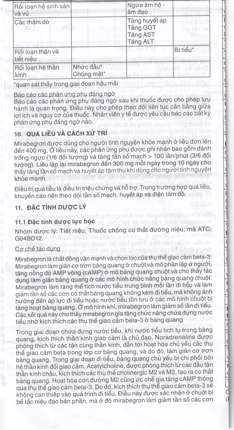 Bảng dưới đây trình bày các phản ứng phụ được quan sát thấy khi dùng mirabegron trong ba nghiên cứu mù đôi, đối chứng giả dược, giai đoạn 3, kéo dài 12 tuần.
