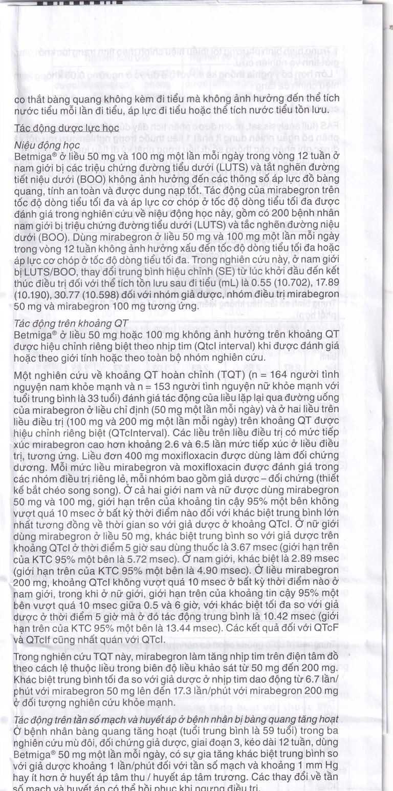 Betmiga ở liều 50 mg hoặc 100 mg không ảnh hưởng trên khoảng QT được hiệu chỉnh riêng biệt theo nhịp tim (Qtcl interval) khi được đánh giá hoặc theo giới tính hoặc theo toàn bộ nhóm nghiên cứu.