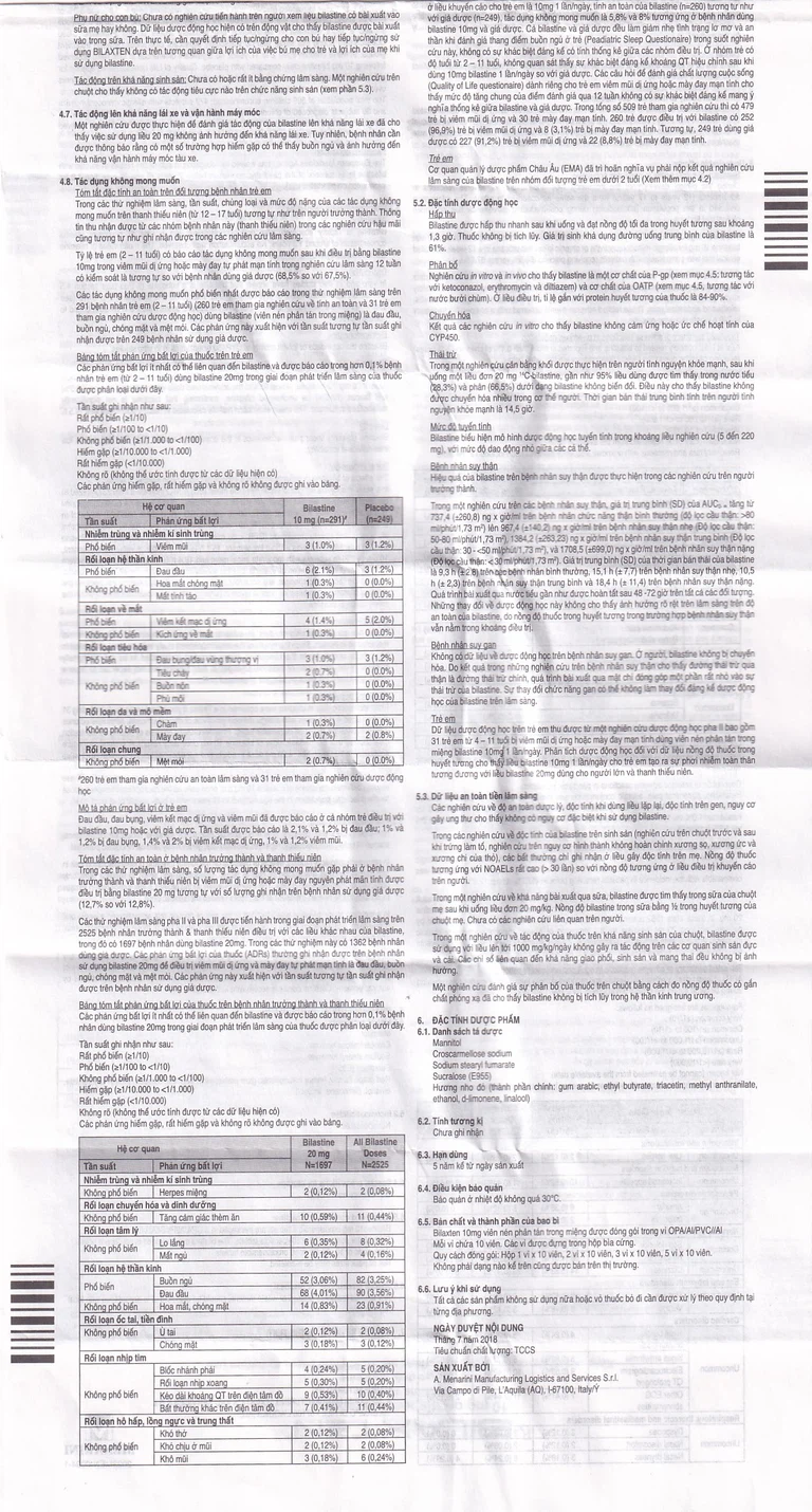 Các thử nghiệm lâm sàng pha II và pha III được tiến hành trong giai đoạn phát triển lâm sàng trên 2525 bệnh nhân trưởng thành & thanh thiếu niên điều trị với các liều khác nhau của bilastine, trong đó có 1697 bệnh nhân dùng bilastine 20mg. Trong các thử nghiệm này có 1362 bệnh nhân dùng giả được.