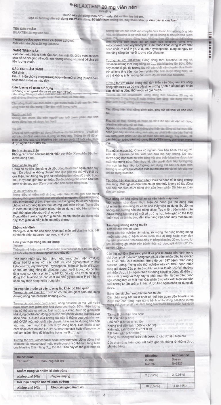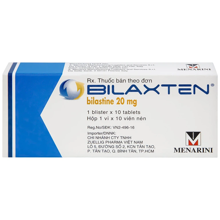 Bilaxten 20mg dạng viên nén của Công ty sản xuất Menarini (Pháp) có thành phần chính là Bilastine. Bilaxten 20mg là thuốc điều trị triệu chứng của bệnh viêm mũi, viêm kết mạc (theo mùa và mạn tính), nổi mề đay.