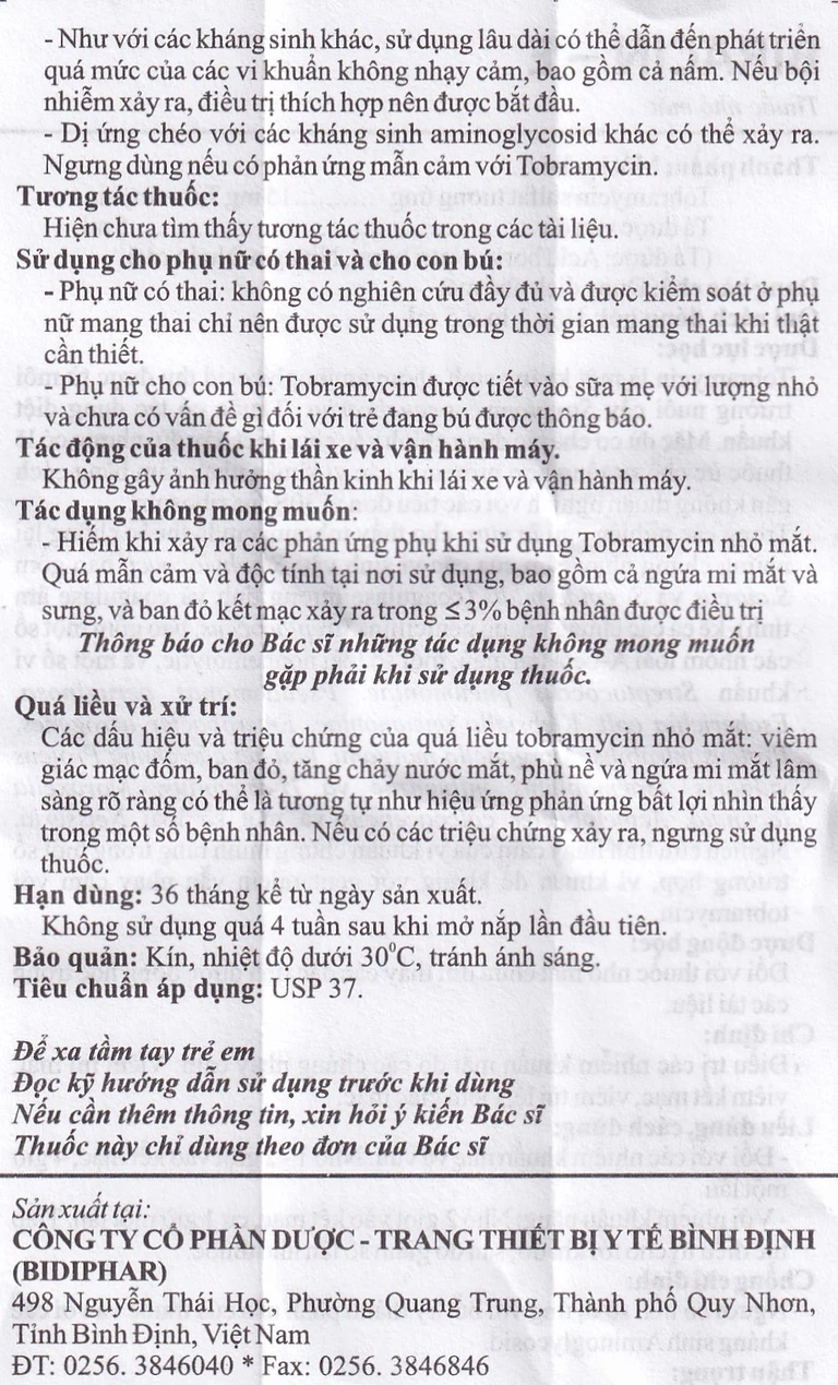 Các dấu hiệu và triệu chứng của quá liều tobramycin nhỏ mắt: viêm giác mạc đốm, ban đỏ, tăng chảy nước mắt, phù nề và ngứa mi mắt lâm sàng rõ ràng có thể là tương tự như hiệu ứng phản ứng bất lợi nhìn thấy trong một số bệnh nhân. Nếu có các triệu chứng xảy ra, ngưng sử dụng thuốc.