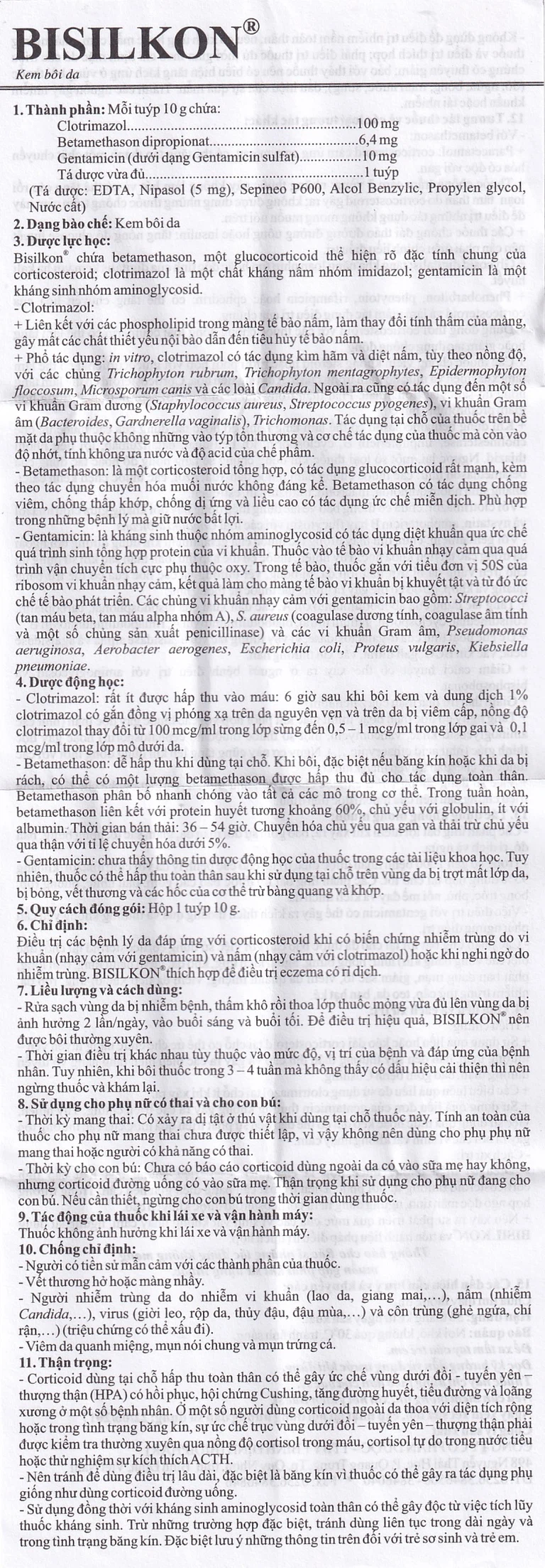 Thành phần của Kem bôi da Bisilkon
