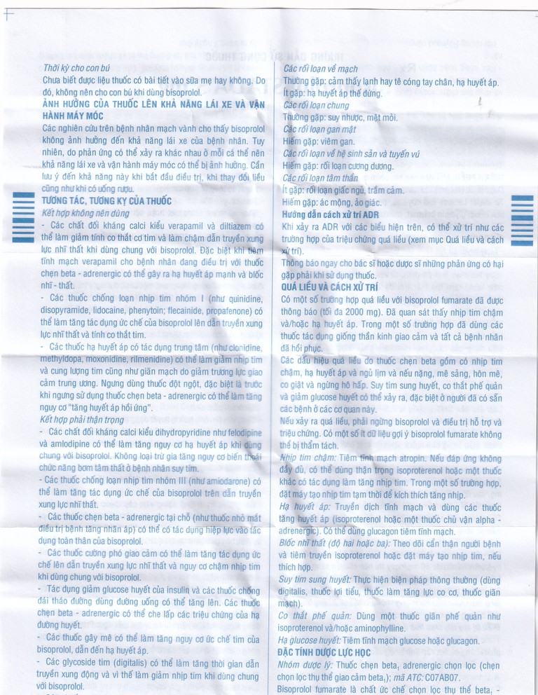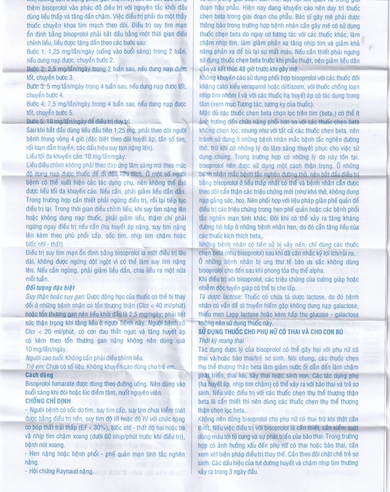 Liều uống khởi đầu của bisoprolol fumarat là 1,25mg x1 lần/ngày. Nếu dung nạp, có thể tăng liều gấp đôi sau 1 tuần và sau đó tăng liều từ từ trong khoảng 1 – 4 tuần cho đến liều tối đa được dung nạp, không nên vượt quá 10mg x 1 lần/ngày.