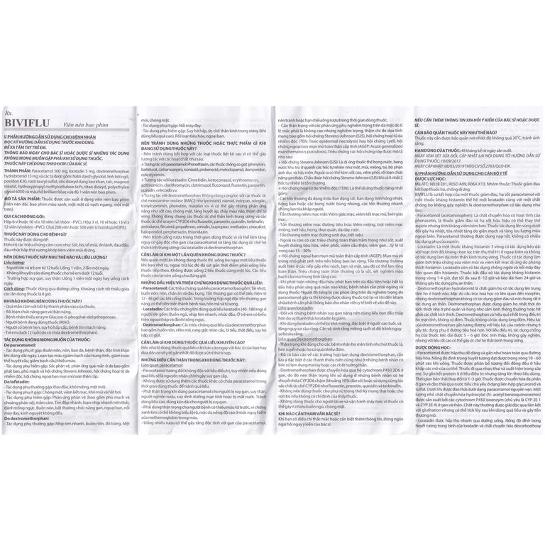 Biviflu là sự kết hợp của một thuốc giảm đau, hạ sốt paracetamol với một thuốc kháng histamin thế hệ mới loratadin cùng với một chất chống họ không gây nghiện là dextromethorphan có tác dụng như
