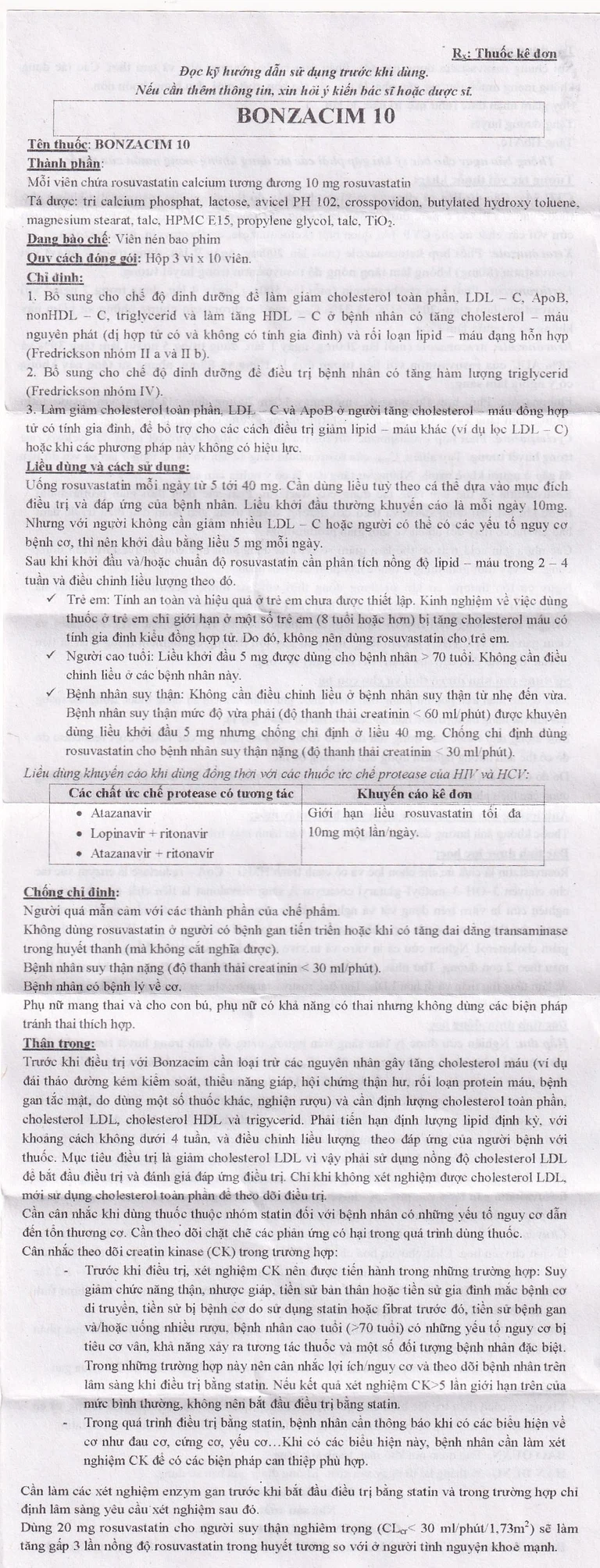 Trước khi điều trị với Bonzacim cần loại trừ các nguyên nhân gây tăng cholesterol máu (ví dụ đái tháo đường kém kiểm soát, thiểu năng giáp, hội chứng thận hư, rối loạn protein máu, bệnh gan tắc mật, do dùng một số thuốc khác, nghiện rượu) và cần định lượng cholesterol toàn phần, cholesterol LDL, cholesterol HDL và trigycerid.