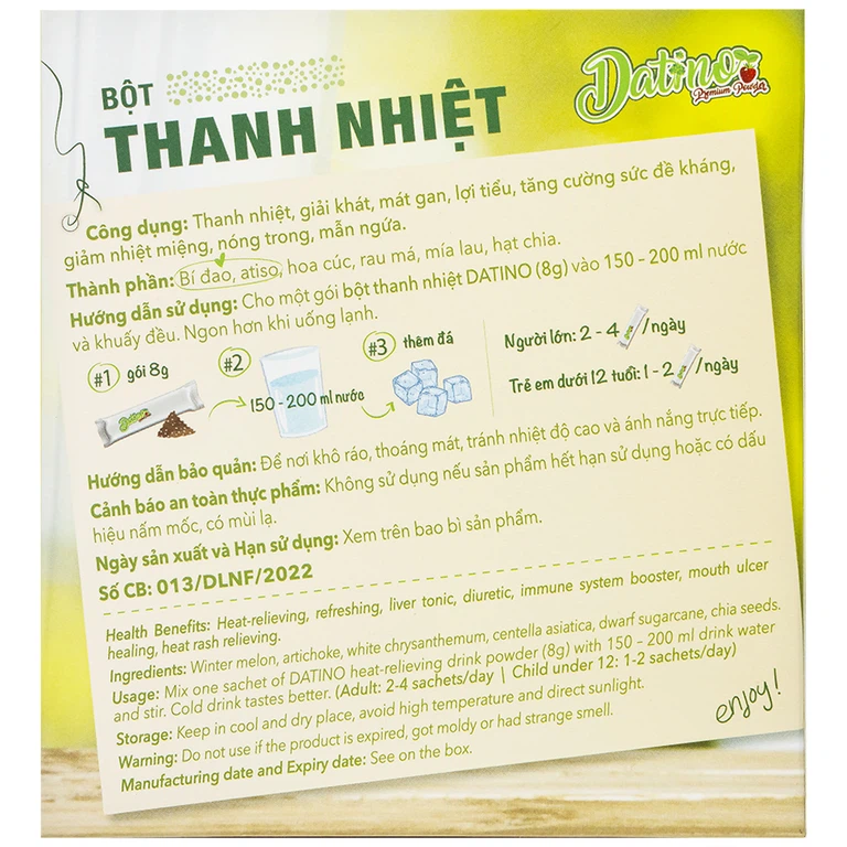 Bột thanh nhiệt Datino Heat-Relieving Drink Powder có công dụng thanh nhiệt, giải khát, mát gan, lợi tiểu, tăng cường sức đề kháng, giảm nhiệt miệng, nóng trong người , mẩn ngứa.