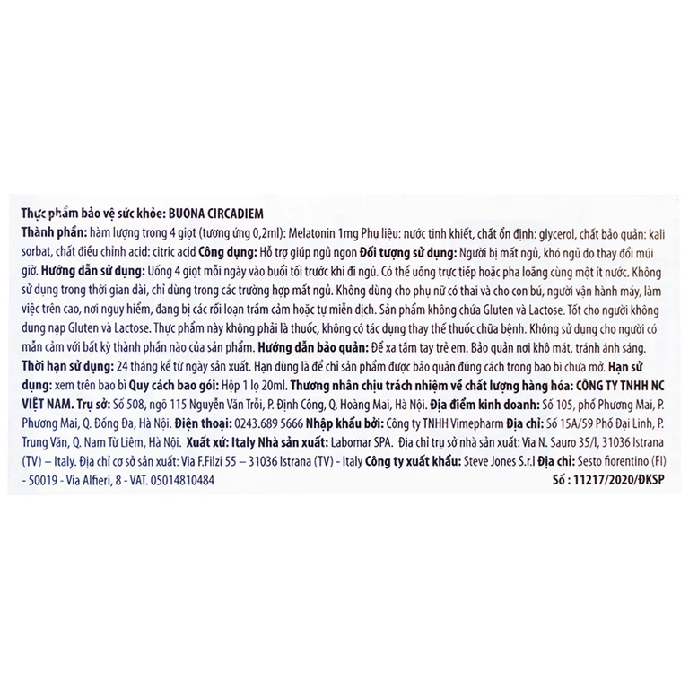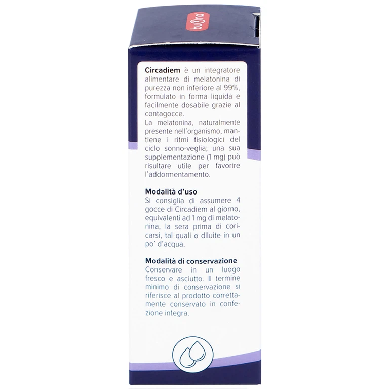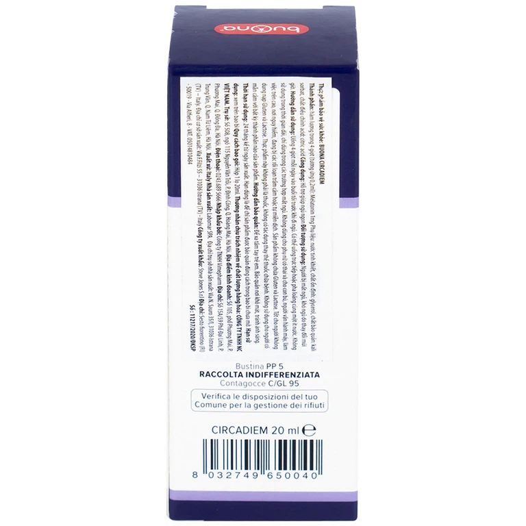 Buona Circadiem là giải pháp hỗ trợ cải thiện giấc ngủ hiệu quả cũng như vô cùng an toàn để sử dụng cho người lớn và cả con nhỏ ở những giai đoạn đầu đời. Với thành phần chính là melatonin tinh khiết đến 99%, sản phẩm hiện đang được nhiều bậc cha mẹ tin dùng với mong muốn điều chỉnh đồng hồ sinh học tự nhiên của con em mình một cách lành tính và tối ưu. Buona Circadiem có xuất xứ từ Ý, được nhập khẩu trực tiếp và tuân thủ các tiêu chuẩn nghiêm ngặt theo quy chuẩn chất lượng châu Âu.