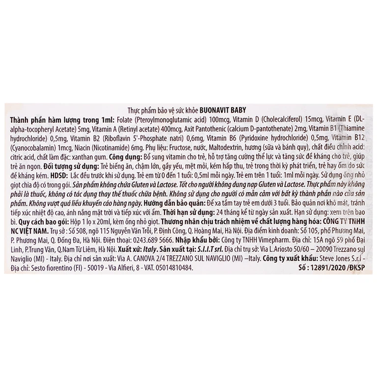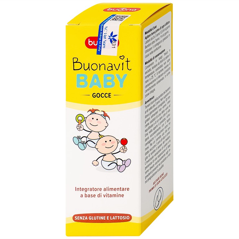 Buonavit Baby là chế phẩm vitamin tổng hợp được thiết kế dành riêng cho trẻ nhỏ, đặc biệt là trẻ sơ sinh với dạng bào chế là dung dịch siro nhỏ giọt. Với công nghệ sản xuất hiện đại, tuân theo các quy chuẩn châu Âu nghiêm ngặt, sản phẩm Buonavit Baby sẽ cung cấp đầy đủ các dưỡng chất thiết yếu cho quá trình phát triển của trẻ được toàn diện và tối ưu hơn.