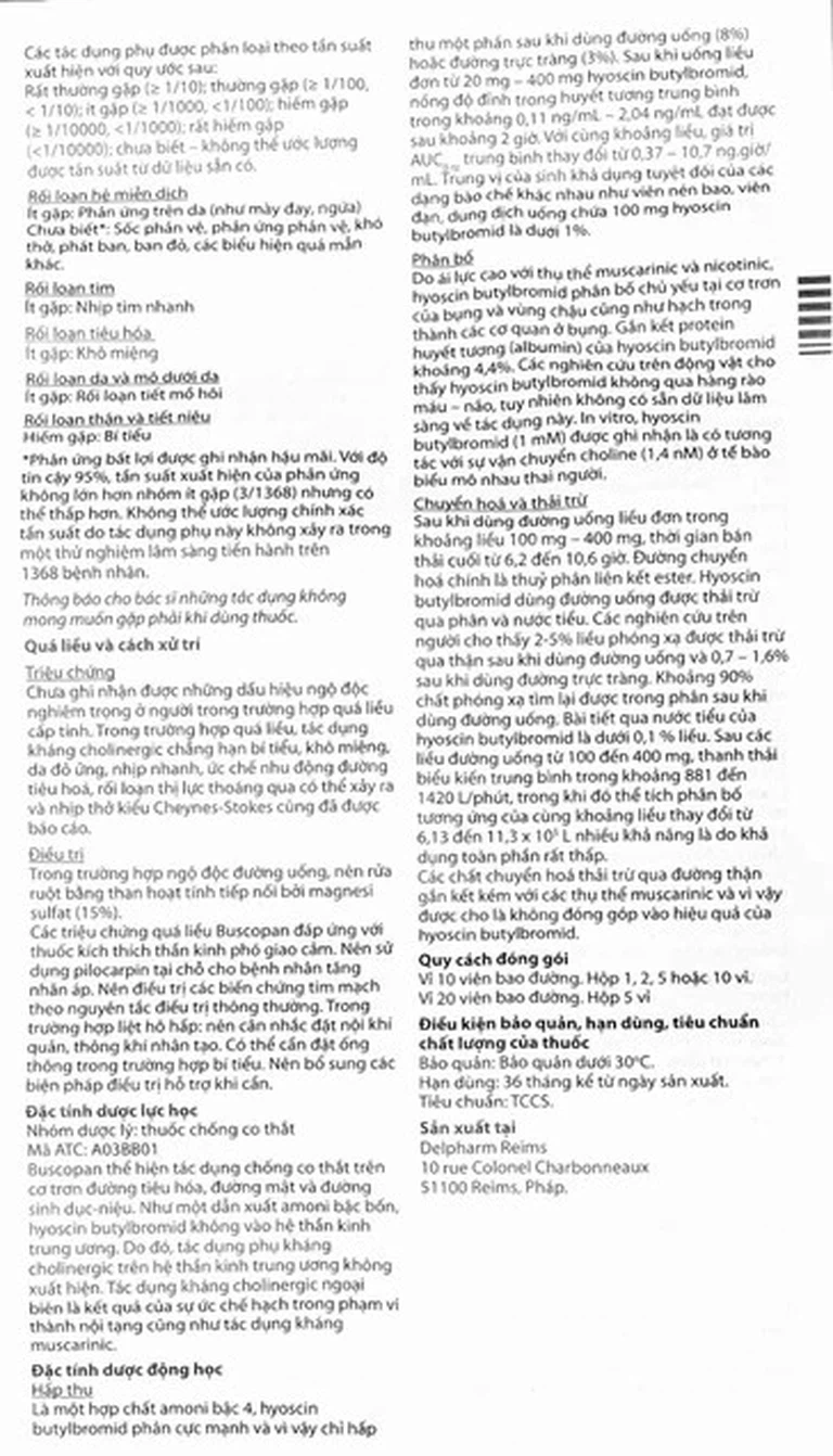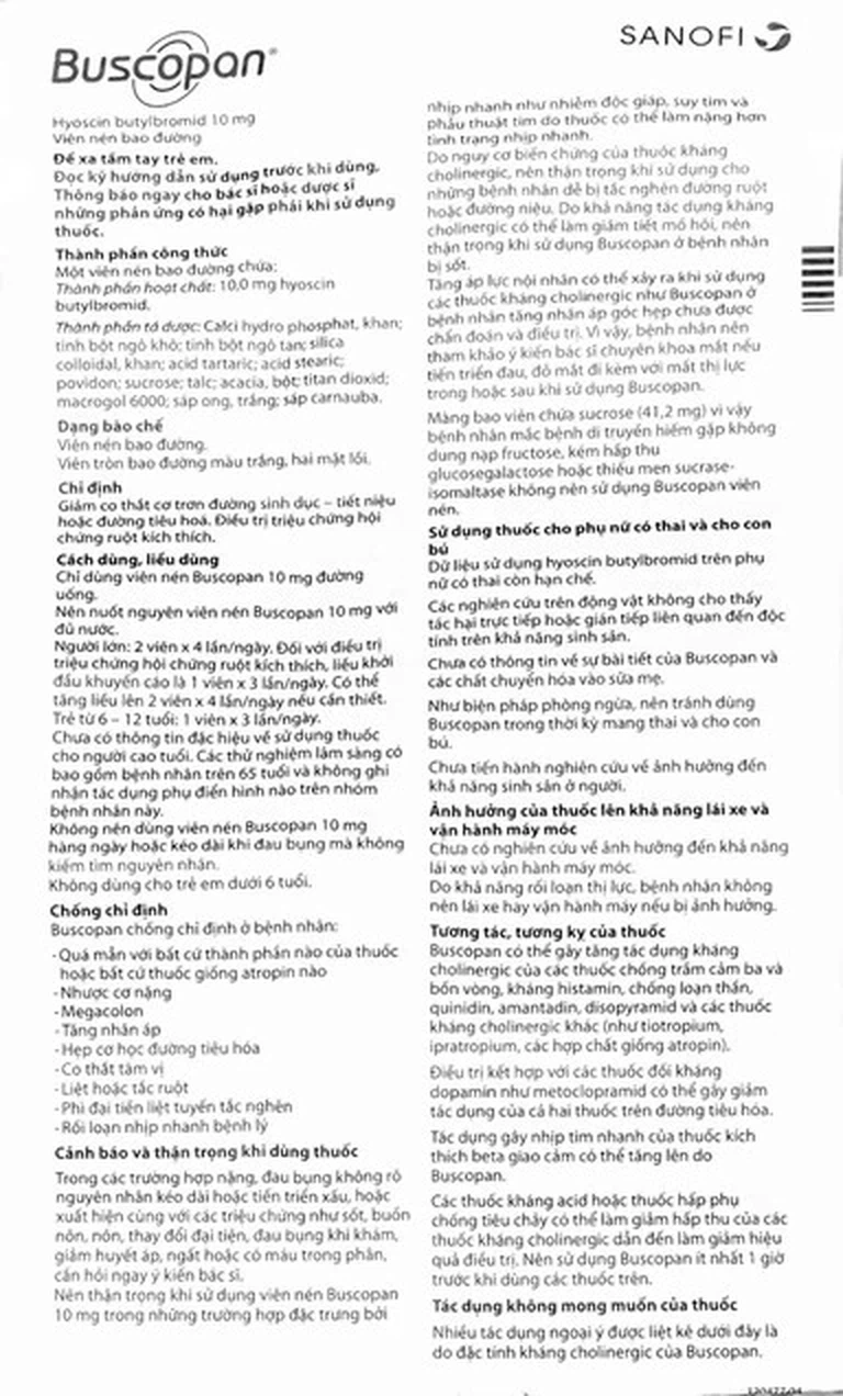 Buscopan 10mg là thuốc dạng viên nén bao đường, có xuất xứ từ Pháp. Được sử dụng để trị co thắt dạ dày – ruột trong hội chứng kích thích ruột, loét dạ dày – tá tràng; trị co thắt và nghẹt đường mật trong viêm túi mật, viêm đường dẫn mật, viêm tụy; trị co thắt đường niệu – sinh dục trong đau bụng kinh, viêm bể thận, viêm bàng quang, sỏi thận.