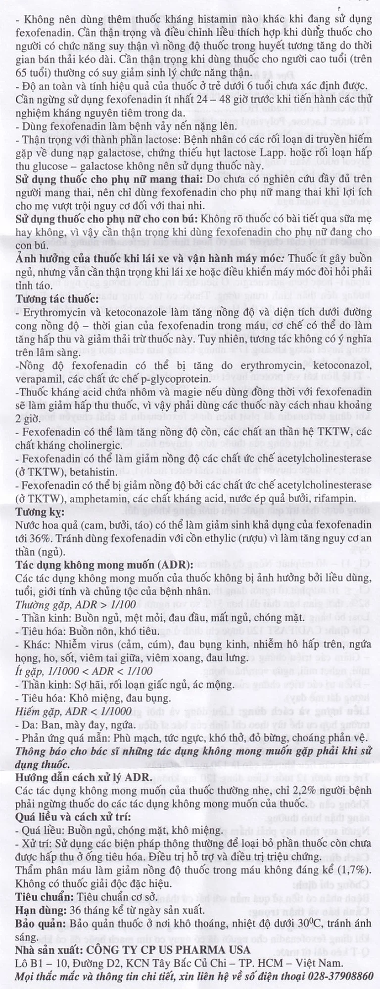Thuốc Cadifast 120 là sản phẩm của US Pharma USA, có thành phần chính là Fexofenadin, được sử dụng trong điều trị các triệu chứng của mề đay vô căn mạn tính, làm giảm ngứa và số lượng dát mề đay. Thuốc Cadifast 120 được điều chế và sản xuất dưới dạng viên nén bao phim màu vàng chứa Fexofenadin HCl 120mg.