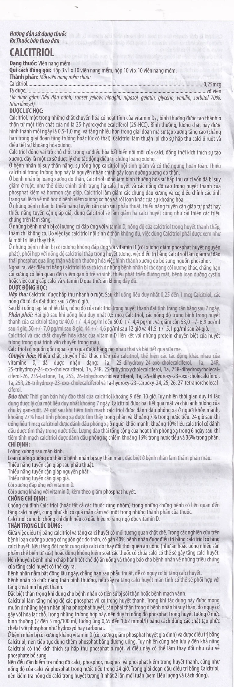 Hai giờ sau khi uống liều duy nhất 0,5 mcg calcitriol, các nồng độ trung bình trong huyết thanh của calcitriol tăng từ 40,0 +/- 4,4 pg/ ml đến 60,0 +/- 4,4 pg/ ml, và giảm còn 53,0 +/- 6,9 pg/ ml sau 4 giờ, 50 +/- 7,0 pg/ ml sau 8 giờ, 44 +/- 4,6 pg/ ml sau 12 giờ và 41,5 +/- 5,1 pg/ ml sau 24 giờ.