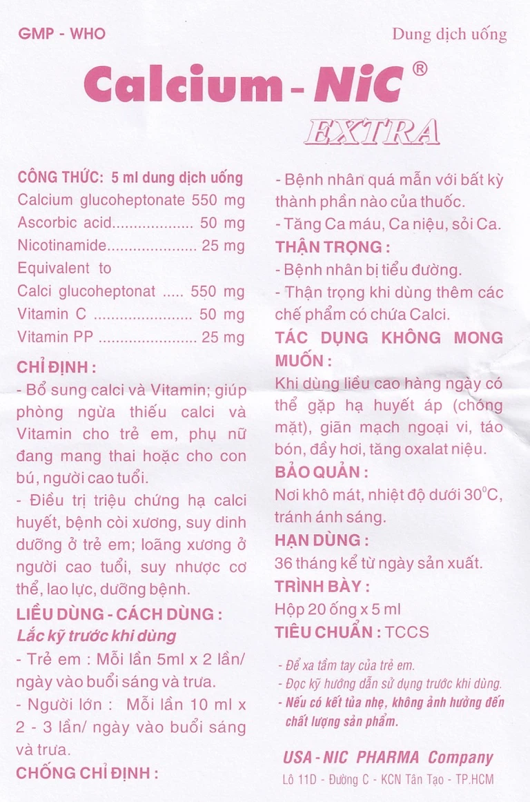 Công dụng của Dung dịch uống Calcium-NIC Extra