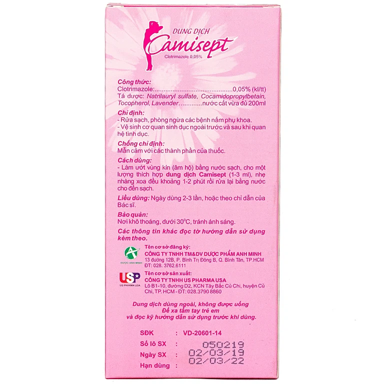 Làm ướt vùng kín (âm hộ) bằng nước sạch, cho một lượng thích hợp dung dịch Camisept (1 – 3 ml), nhẹ nhàng thoa đều khoảng 1 – 2 phút rồi rửa lại bằng nước cho đến sạch.