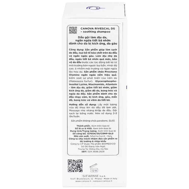 Canova Rivescal DS Soothing Shampoo là một sản phẩm dầu gội đầu được khuyến nghị trong việc sạch da đầu và ngăn ngừa tiết bã nhờn, cũng như hiệu quả trong việc chống lại tình trạng da dầu và bong tróc. Sản phẩm không chứa parabens, SLES nên lành tính cho người sử dụng.