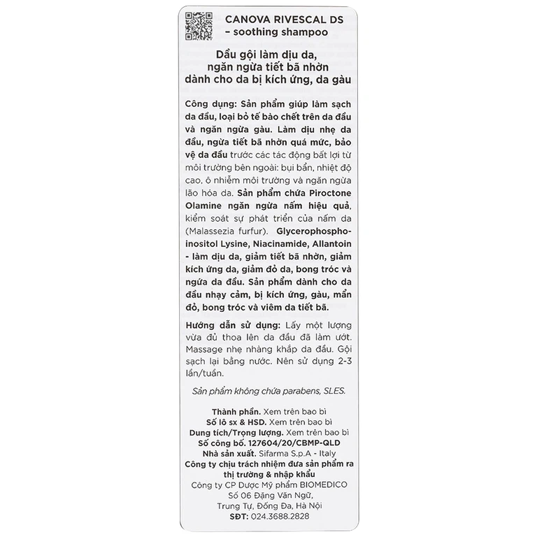 Canova Rivescal DS Soothing Shampoo với sự kết hợp giữa các hoạt chất 0.4% Piroctone Olamin, Allantoin và Niacinamide giúp làm dịu, chống vi khuẩn và ngăn ngừa tiết bã nhờn, giúp bạn có làn da đầu sạch khỏe và dễ chăm sóc hơn.