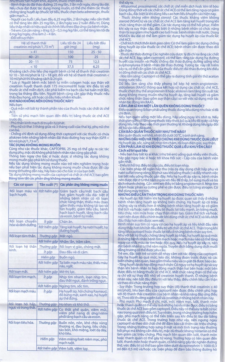 Captopril nên dùng phối hợp với thuốc lợi tiểu. Liều thường dùng là 6,25 – 50 mg/lần, 2 lần/ngày; khi cần, có thể tăng liều lên 50 mg/lần, 2 lần/ngày. Người bệnh giảm thể tích tuần hoàn hoặc nồng độ natri máu dưới 130 mmol/lít, cần dùng liều ban đầu thấp hơn.