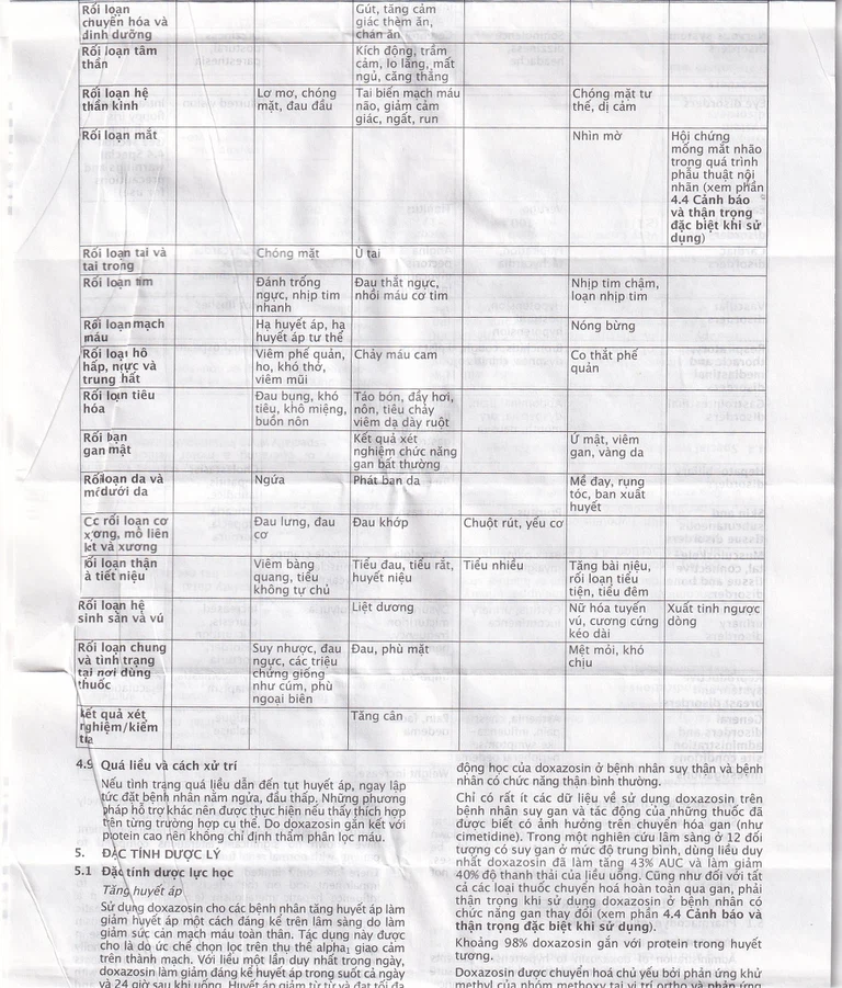 Các nghiên cứu lâm sàng có kiểm soát cho thấy các phản ứng thông thường nhất liên quan đến việc sử dụng doxazosin bao gồm các phản ứng do thay đổi tư thế (hiếm gặp kèm theo ngất) hoặc các phản ứng không đặc hiệu bao gồm: