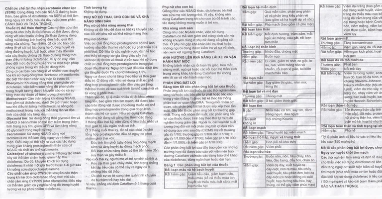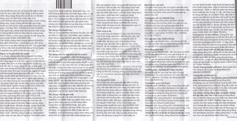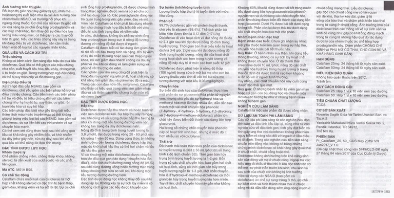 Nên định kỳ đánh giá lại nhu cầu giảm triệu chứng của bệnh nhân và sự đáp ứng với điều trị, đặc biệt khi điều trị liên tục hơn 4 tuần. Tác dụng trên huyết học Việc sử dụng Cataflam 50mg chỉ được khuyến cáo đối với điều trị ngắn hạn. Tuy nhiên, nếu Cataflam 50mg được dùng trong một thời gian dài, nên theo dõi số lượng huyết cầu như với các NSAID khác. Cũng như các NSAID khác, diclofenac có thể ức chế tạm thời sự ngưng kết tiểu cầu. Bệnh nhân bị khiếm khuyết về sự cầm máu cần được theo dõi cẩn thận.