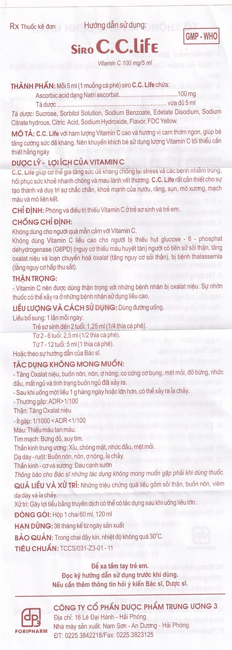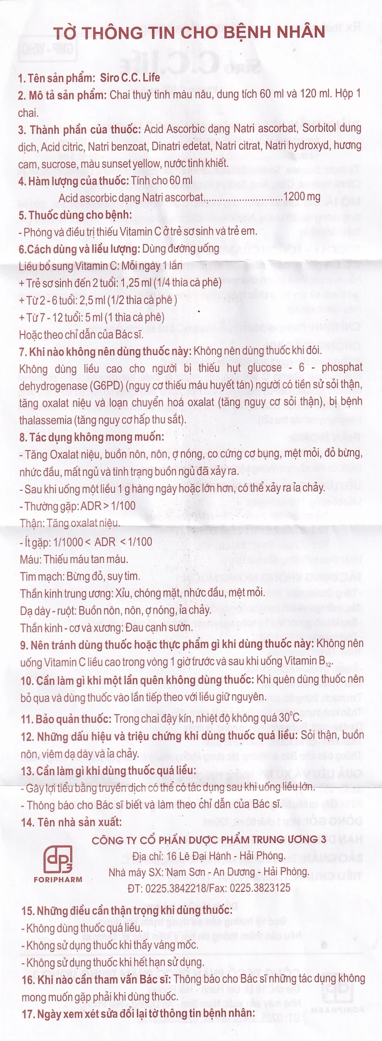 Siro C.C.Life được sản xuất bởi Công ty Cổ phần Dược phẩm Trung Ương 3, với thành phần chính Acid ascorbic, là thuốc dùng để phòng và điều trị thiếu vitamin C ở trẻ sơ sinh và trẻ em.