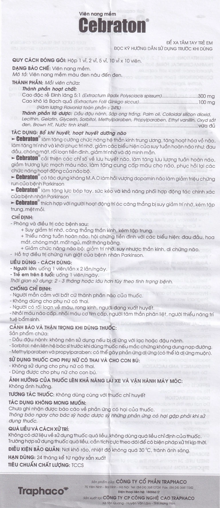 Cebraton cải thiện các chỉ số về lưu huyết não, làm tăng lưu lượng tuần hoàn não, giảm trương lực mạch máu não, làm tăng cung cấp máu cho não, phục hồi lại các chức năng hoạt động của não bộ.