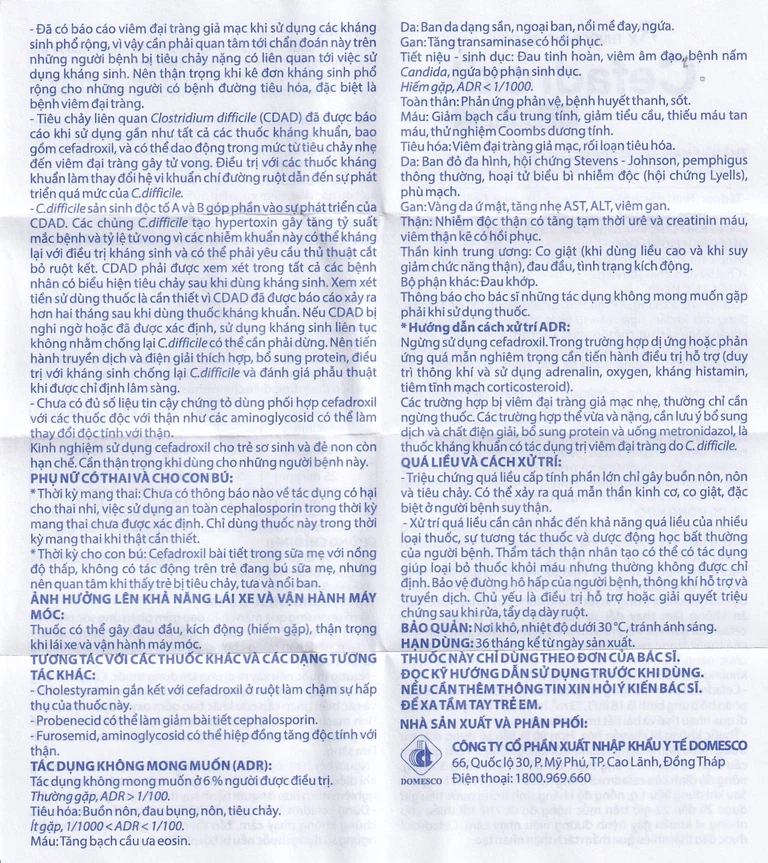 Cefadroxil 500mg của Công ty cổ phần nhập khẩu y tế Domesco, thành phần chính Cefadroxil, Cefadroxil hỗ trợ điều trị nhiễm khuẩn đường tiết niệu: Viêm thận – bể thận cấp và mạn tính, viêm bàng quang, viêm niệu đạo, nhiễm khuẩn phụ khoa, nhiễm khuẩn đường hô hấp: viêm amidan, viêm họng, viêm phế quản phổi và viêm phổi thùy, viêm phế quản cấp và mạn tính, áp xe phổi, viêm mủ màng phổi,…