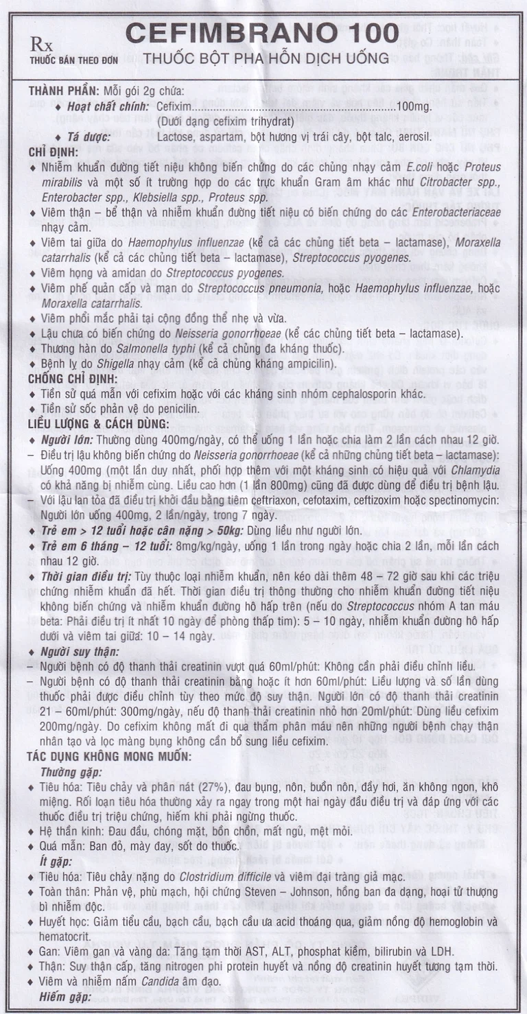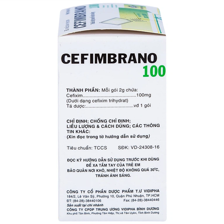 Thuốc Cefimbrano 100 là sản phẩm của Dược phẩm Vidiphar, chứa dược chất chính là cefixim – kháng sinh cephalosporin thế hệ thứ 3, được dùng để điều trị các trường hợp nhiễm khuẩn do vi khuẩn nhạy cảm gây ra.