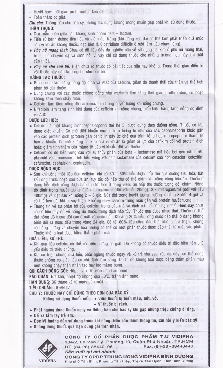 - Cefixim làm tăng nồng độ carbamazepin trong huyết tương khi uống chung.