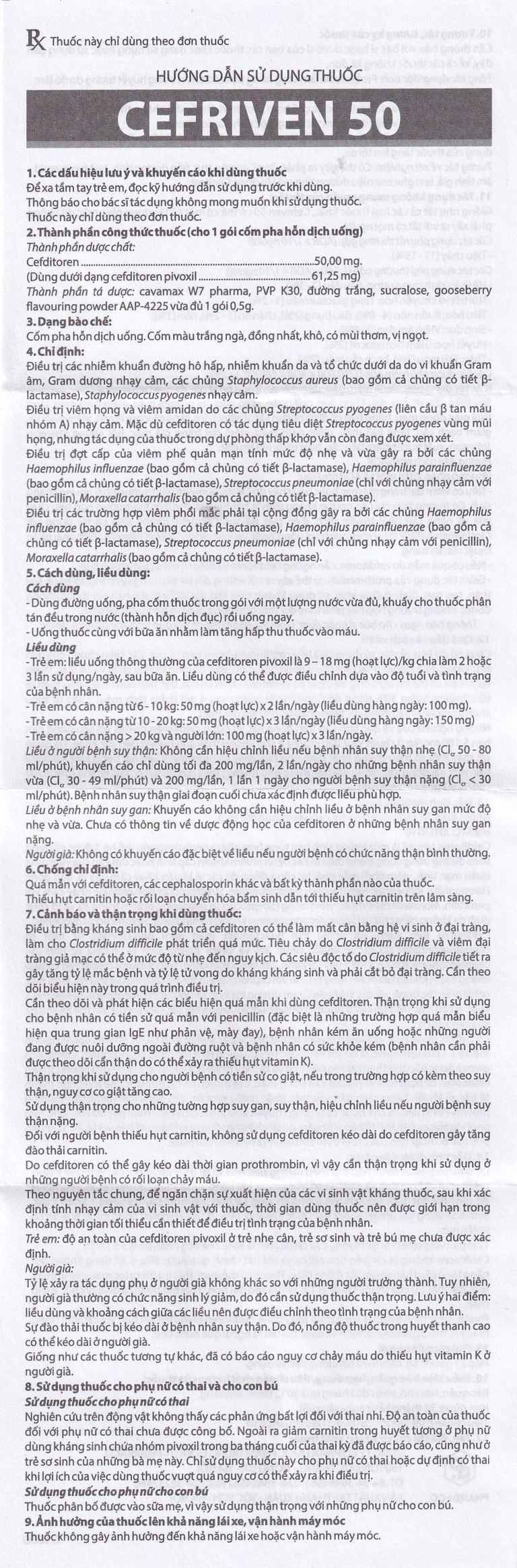 Thuốc Cefriven 50 dùng đường uống, pha cốm thuốc trong gói với một lượng nước vừa đủ, khuấy cho thuốc phân tán đều trong nước (thành hỗn dịch đục) rồi uống ngay. Uống thuốc cùng với bữa ăn nhằm làm tăng hấp thu thuốc vào máu.