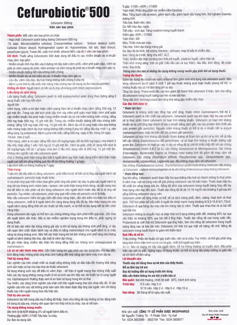 Cefurobiotic 500 của Công ty Cổ phần Dược Mediphar, hoạt chất chính là Cefuroxim, là thuốc kháng sinh dùng để điều trị các nhiễm khuẩn do vi khuẩn nhạy cảm. Cefurobiotic 500 được bào chế dưới dạng viên nén bao phim, mỗi viên nén chứa 500 mg Cefuroxim. Hộp 5 vỉ x 10 viên.