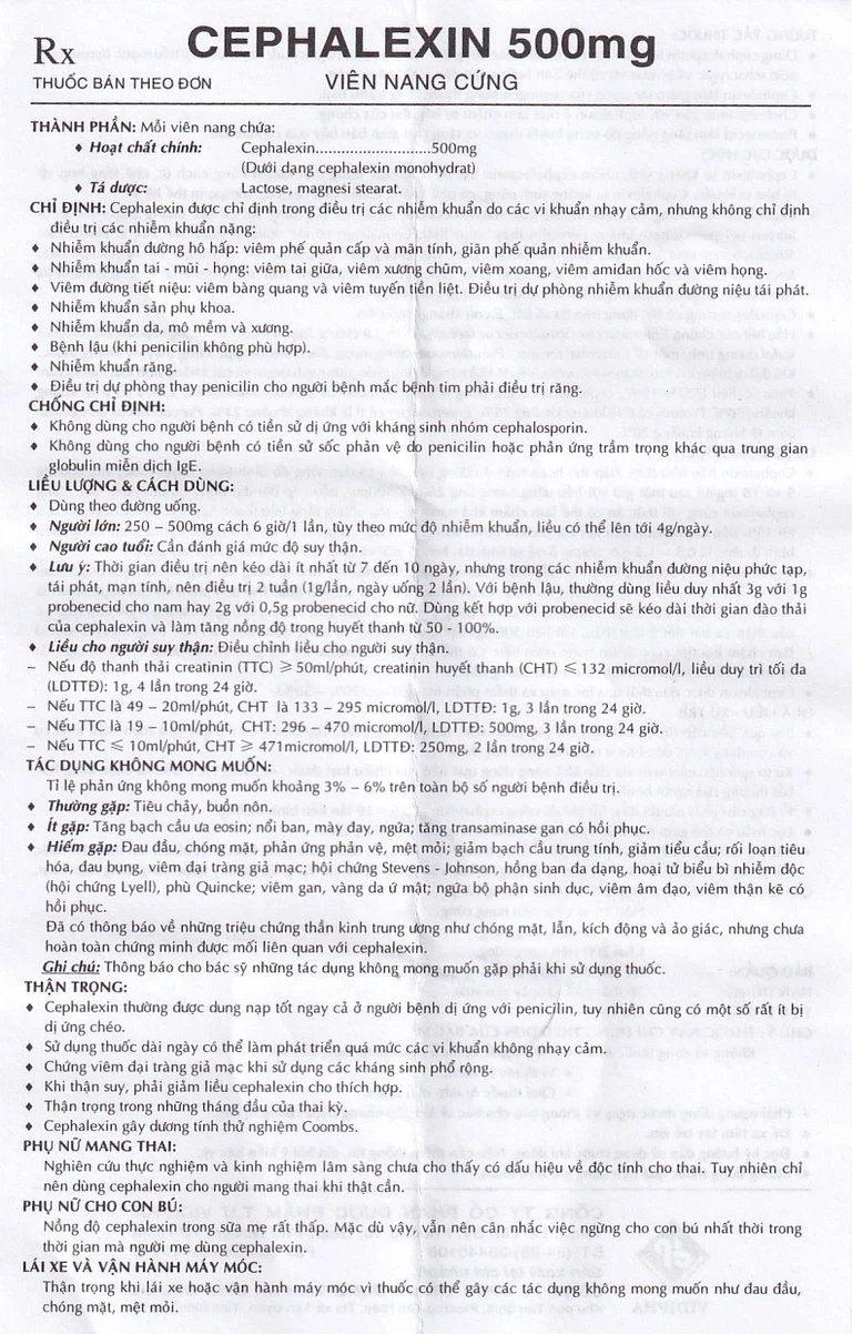 Cephalexin là kháng sinh nhóm cephalosporin thế hệ 1, có tác dụng diệt khuẩn bằng cách ức chế tổng hợp vỏ tế bào vi khuẩn. Cephalexin là kháng sinh uống, có phổ kháng khuẩn như các cephalosporin thế hệ 1.