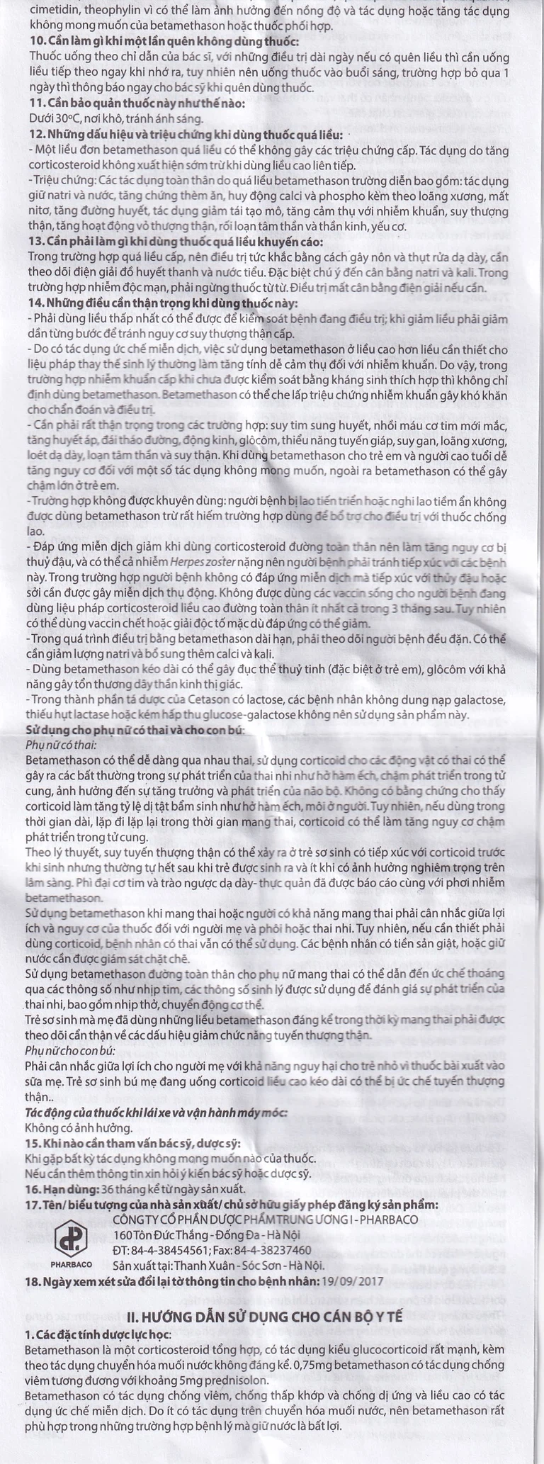 Chuyển hóa: Thuốc được chuyển hoá chủ yếu ở gan và thải trừ chủ yếu qua thận với tỷ lệ chuyển hóa dưới 5%. Betamethason là một glucocorticoid. Tác dụng kéo dài với thời gian bán thải khoảng 36 – 54 giờ.