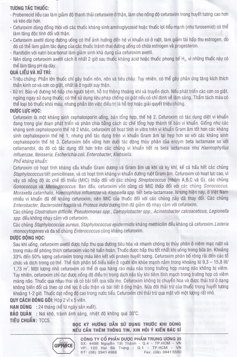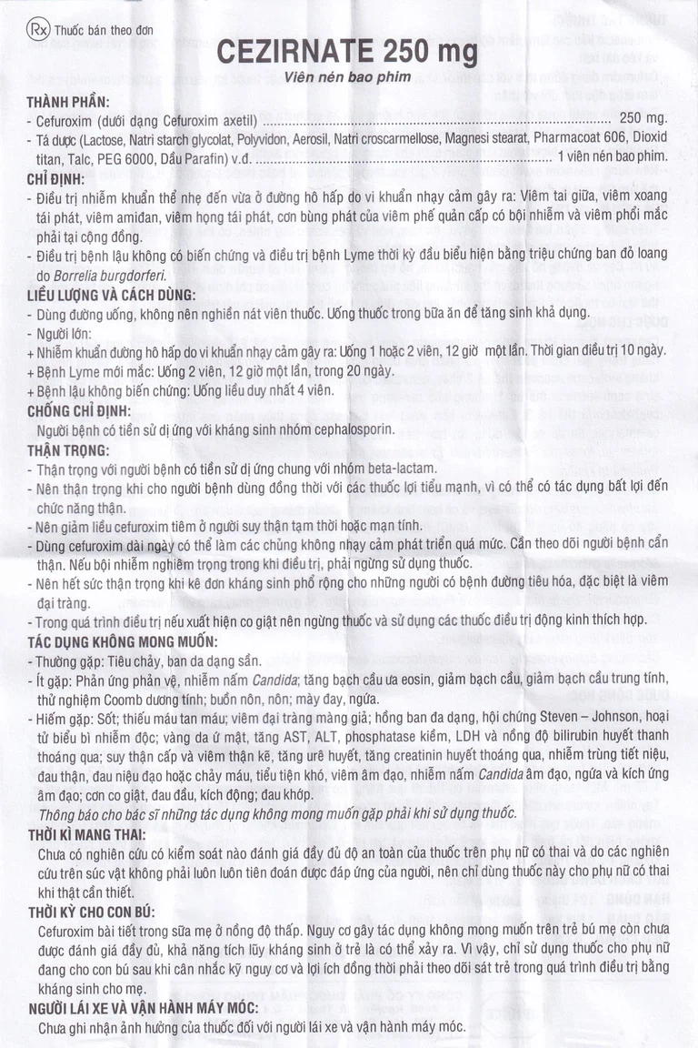 CEZIRNATE 250 mg do CÔNG TY CỔ PHẦN DƯỢC PHẨM TRUNG ƯƠNG 25 sản xuất. Thuốc Cezirnate 250 được dùng để điều trị nhiễm khuẩn thể nhẹ đến vừa ở đường hô hấp dưới, viêm tai giữa và viêm xoang tái phát, viêm amiđan và viêm họng tái phát do vi khuẩn nhạy cảm gây ra. Hộp 2 vỉ x 5 viên nén bao phim, chứa Cefuroxim (dưới dạng Cefuroxim axetil) 250 mg.