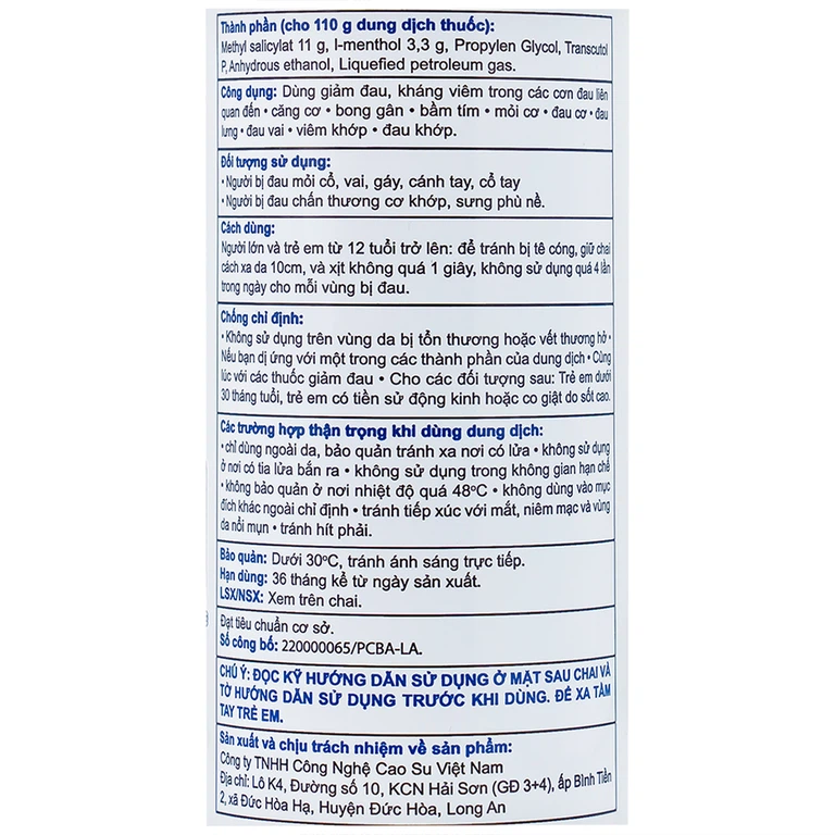 - Xác định chính xác vị trí bị thương, xịt xung quanh vùng cơ thể đang bị đau để giảm đau nhanh chóng. Không dùng sản phẩm vào mục đích khác ngoài chỉ định. Tránh tiếp xúc với mắt, niêm mạc, vùng da nổi mụn và tránh hít phải.