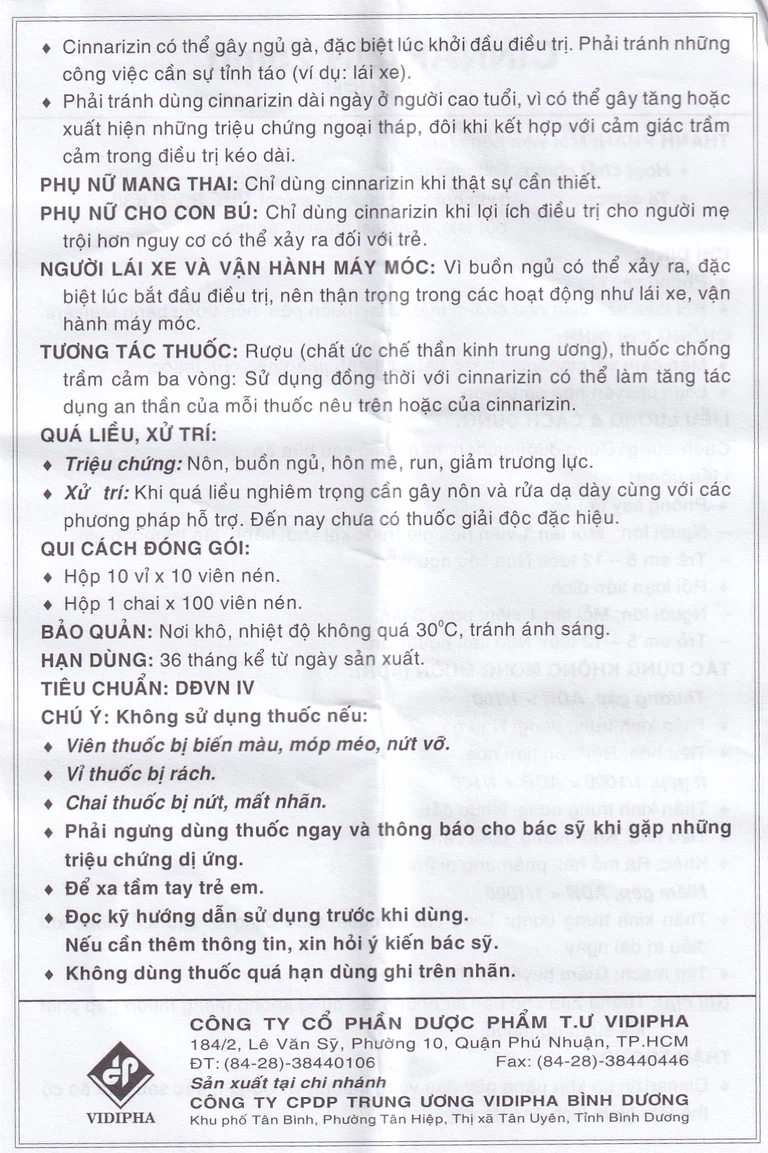 Rượu (chất ức chế thần kinh trung ương), thuốc chống trầm cảm ba vòng: Sử dụng đồng thời với cinnarizin có thể làm tăng tác dụng an thần của mỗi thuốc nêu trên hoặc của cinnarizin.