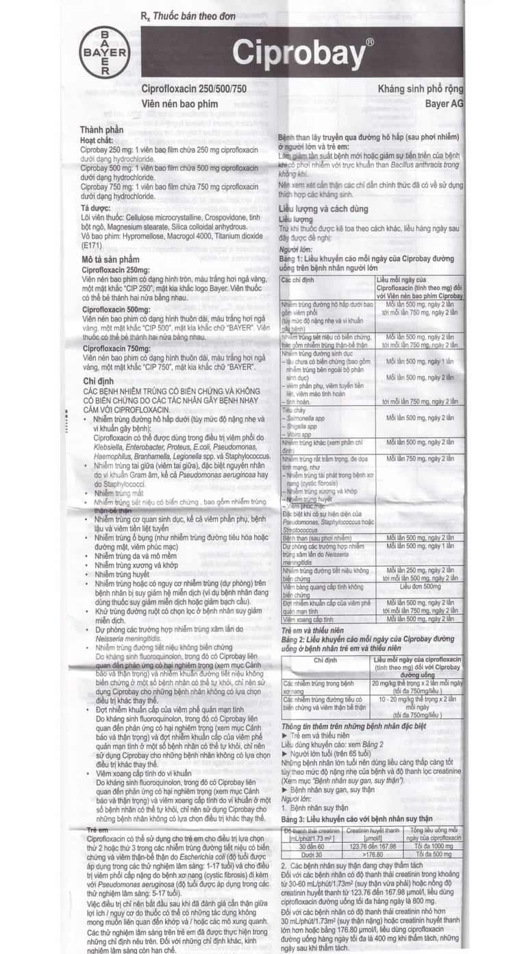Ciprobay 500mg được sản xuất bởi Bayer Pharma AG (CHLB Đức), thành phần chính là Ciprofloxacin. Đây là thuốc được chỉ định các bệnh nhiễm trùng có biến chứng và không có biến chứng do các tác nhân gây bệnh nhạy cảm với ciprofloxacin như nhiễm trùng hô hấp, nhiễm trùng tai, nhiễm trùng mắt, nhiễm trùng thận hoặc đường tiết niệu, nhiễm trùng cơ quan sinh dục, kể cả viêm phần phụ, bệnh lậu và viêm tiền liệt tuyến…
