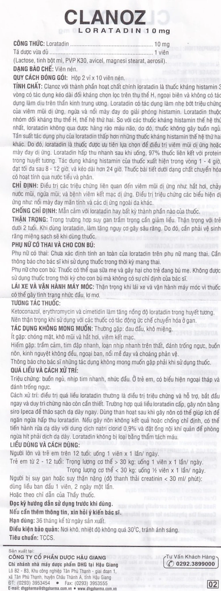 Thuốc Clanoz là sản phẩm được sản xuất bởi Công ty Cổ phần Dược Hậu Giang, với hoạt chất chính là Loratadine, thuốc có dùng để điều trị các triệu chứng liên quan đến viêm mũi dị ứng như: hắt hơi, chảy nước mũi, ngứa mũi; và bệnh viêm kết mạc dị ứng; điều trị triệu chứng các biểu hiện dị ứng như: nổi mày đay mãn tính và các dị ứng ngoài da khác. Thuốc Clanoz được bào chế ở dạng viên nén, mỗi viên nén chứa 10mg loratadin. Hộp 2 vỉ x 10 viên nén.