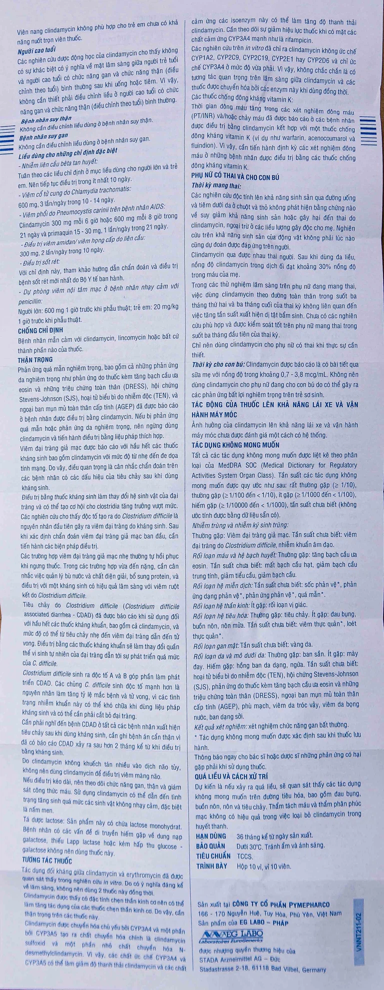 Thời gian đông máu tăng trong các xét nghiệm đông máu (PT/INR) và/hoặc chảy máu đã được báo cáo ở các bệnh nhân được điều trị bằng clindamycin kết hợp với một thuốc chống đông kháng vitamin K (ví dụ như warfarin, acenocoumarol và fluindion). Vì vậy, cần tiến hành định kỳ các xét nghiệm đông máu & những bệnh nhân được điều trị bằng các thuốc chống đông kháng vitamin K.