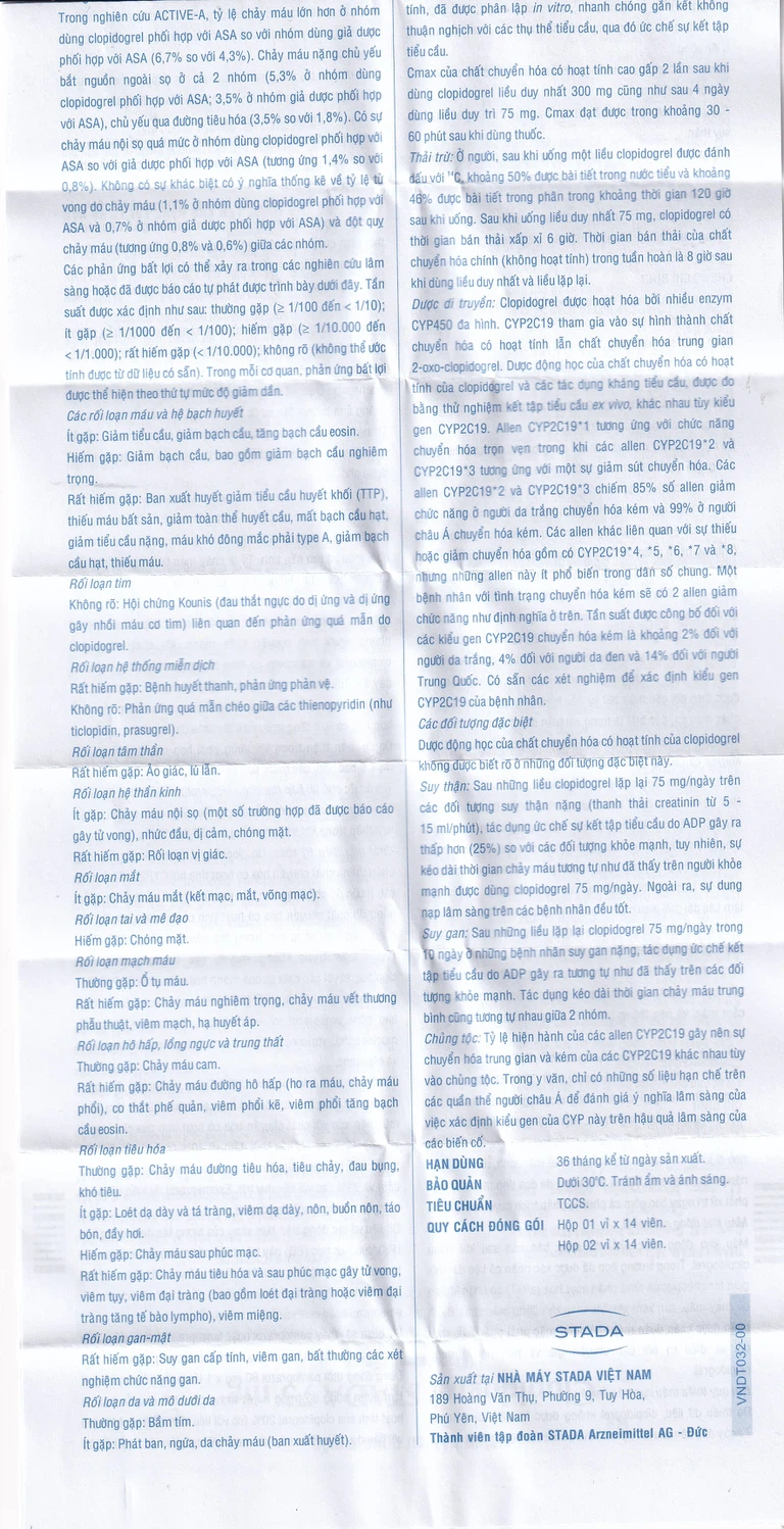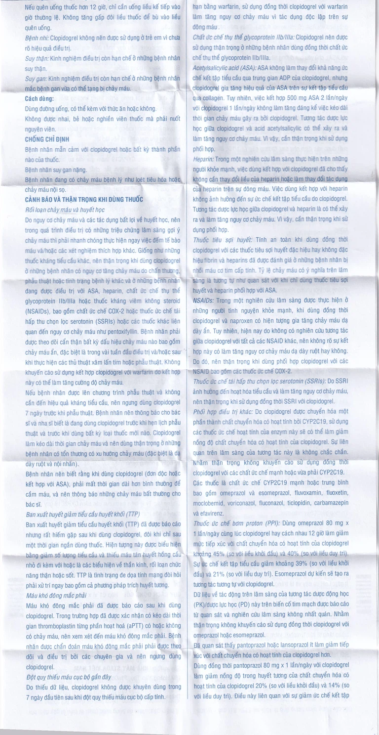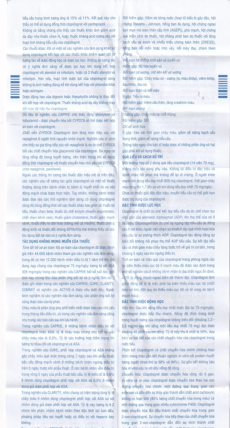 Tóm tắt hồ sơ an toàn:Độ an toàn của clopidogrel đã được đánh giá trên 44.000 bệnh nhân tham gia các nghiên cứu lâm sàng, trong đó có hơn 12.000 bệnh nhân điều trị từ 1 năm trở lên. Độ dung nạp chung của clopidogrel 75 mg/ngày tương tự với ASA 325 mg/ngày trong các nghiên cứu CAPRIE bất kể tuổi tác, giới tính hay chủng tộc. Các phản ứng bất lợi có ý nghĩa lâm sàng được ghi nhận trong các nghiên cứu CAPRIE, CURE, CLARITY, COMMIT và nghiên cứu ACTIVE-A được nêu dưới đây. Ngoài kinh nghiệm từ các nghiên cứu lâm sàng, các phản ứng bất lợi cũng được báo cáo tự phát.
