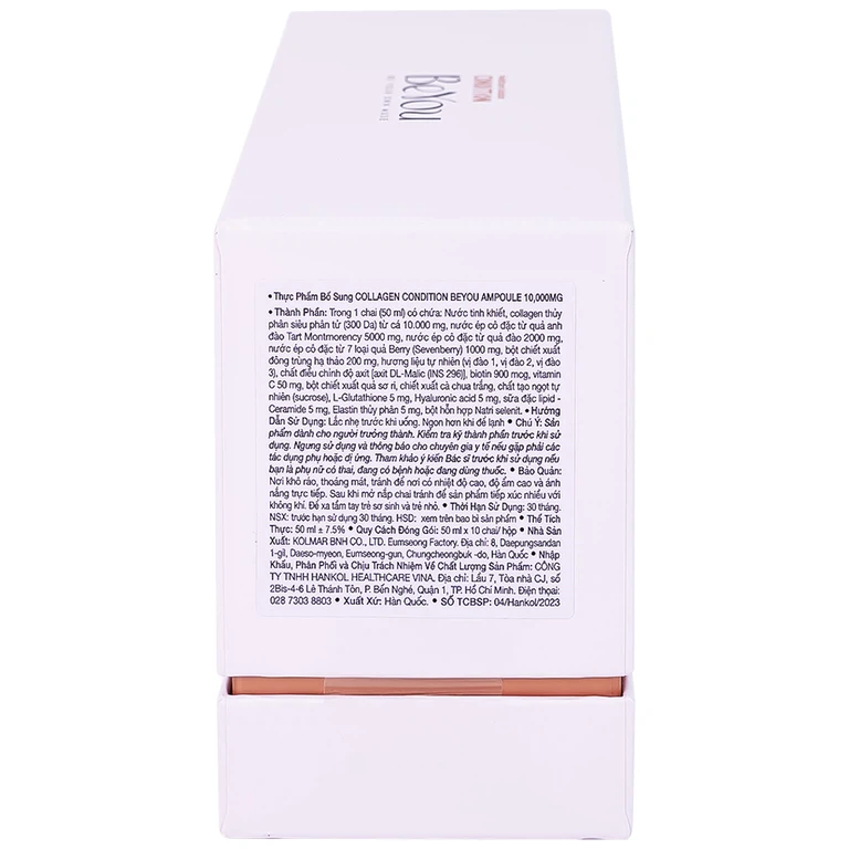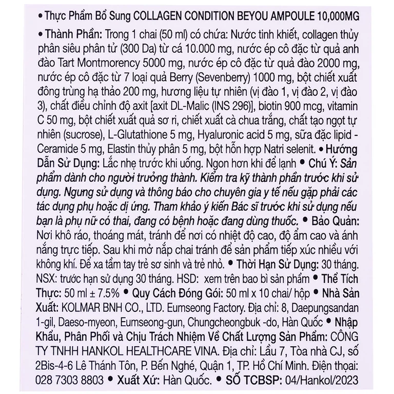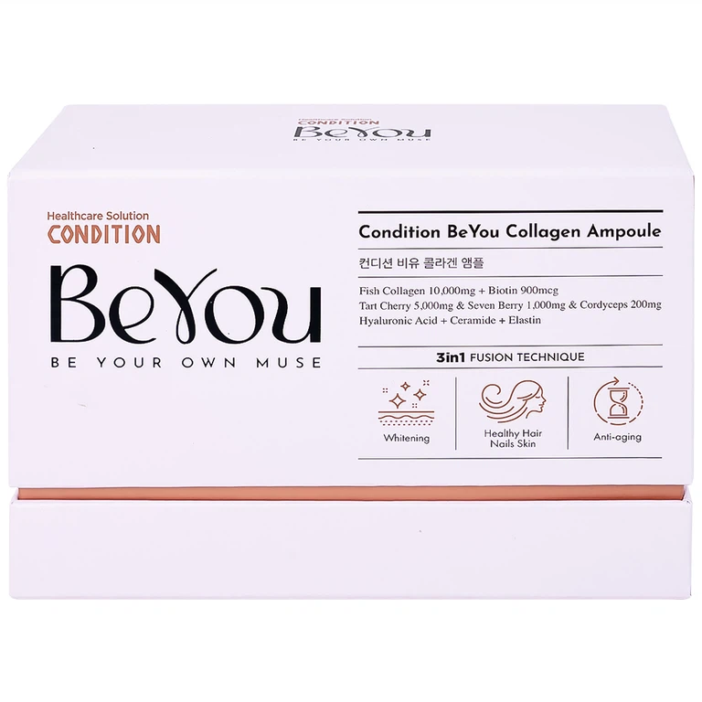 Collagen Condition BeYou Ampoule 10,000mg giúp bổ sung collagen thủy phân siêu phân tử, biotin, chiết xuất nhiều loại quả cùng các thành phần khác.