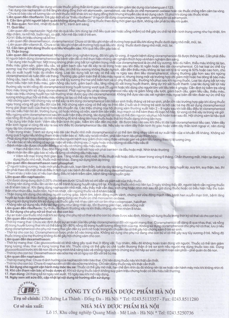 Thận trọng khác: Tránh sử dụng kéo dài các thuốc nhỏ mắt cloramphenlcol vì có thể làm tăng nhạy cảm và sự xuất hiện của vi khuẩn đề kháng. Không sử dụng quá 5 ngày nếu không tham khảo ý kiến bác sĩ. Nếu xảy ra bội nhiễm, phải tiến hành liệu pháp thích hợp.
