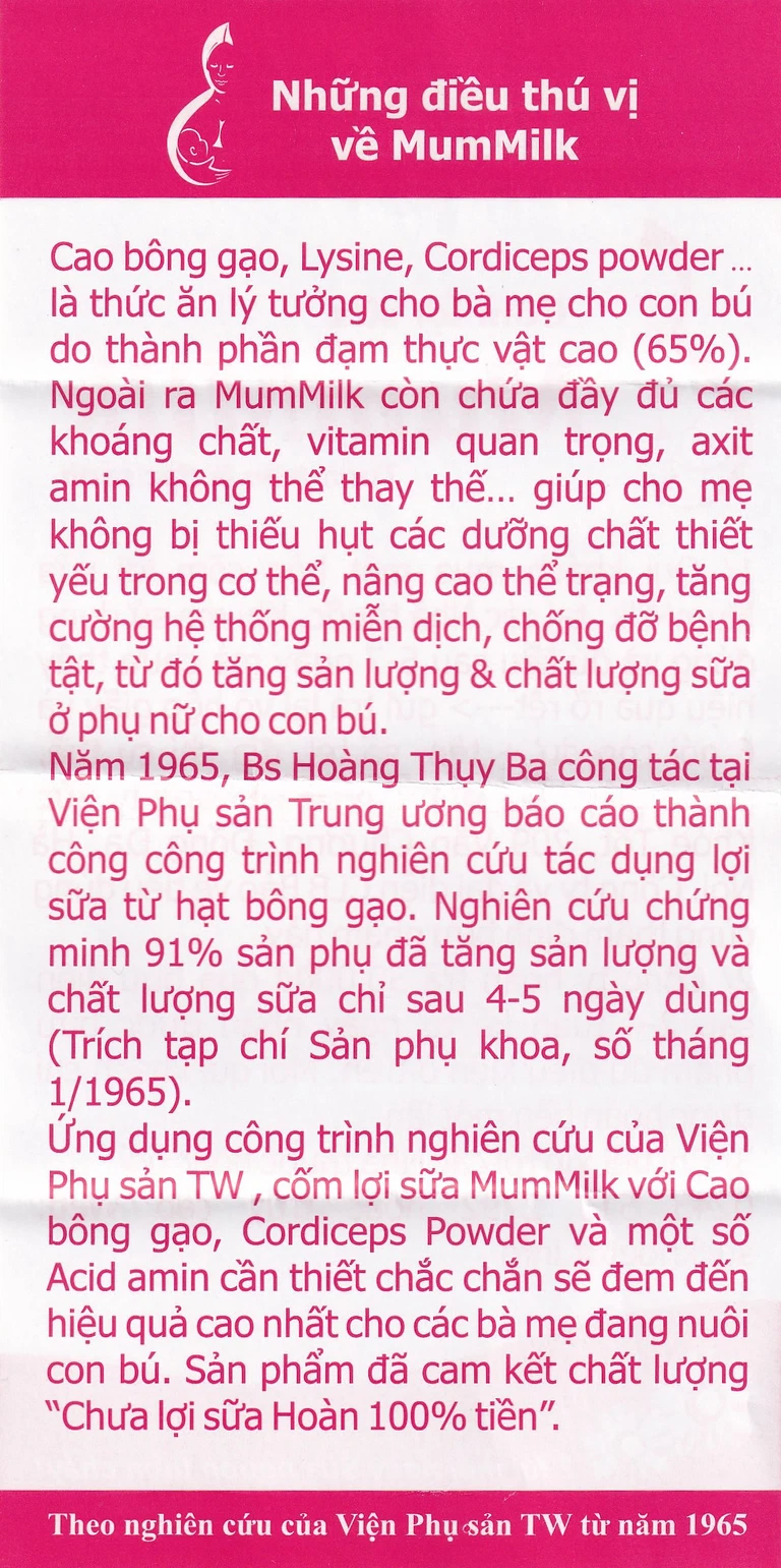 Mum Milk là trợ thủ đắc lực giúp mẹ có nguồn sữa dồi dào và chất lượng. Sản phẩm giúp tăng tiết sữa mẹ , đáp ứng nhu cầu của bé yêu có tiến trình phát triển tốt cả về thể chất và trí tuệ. Cốm lợi sữa Mum Milk có hương vị thơm dịu nhẹ, dễ uống. Sản phẩm không chứa chất bảo quản nên rất an toàn cho sức khỏe của bé, không gây bất kỳ tác dụng phụ cho cả mẹ và con.